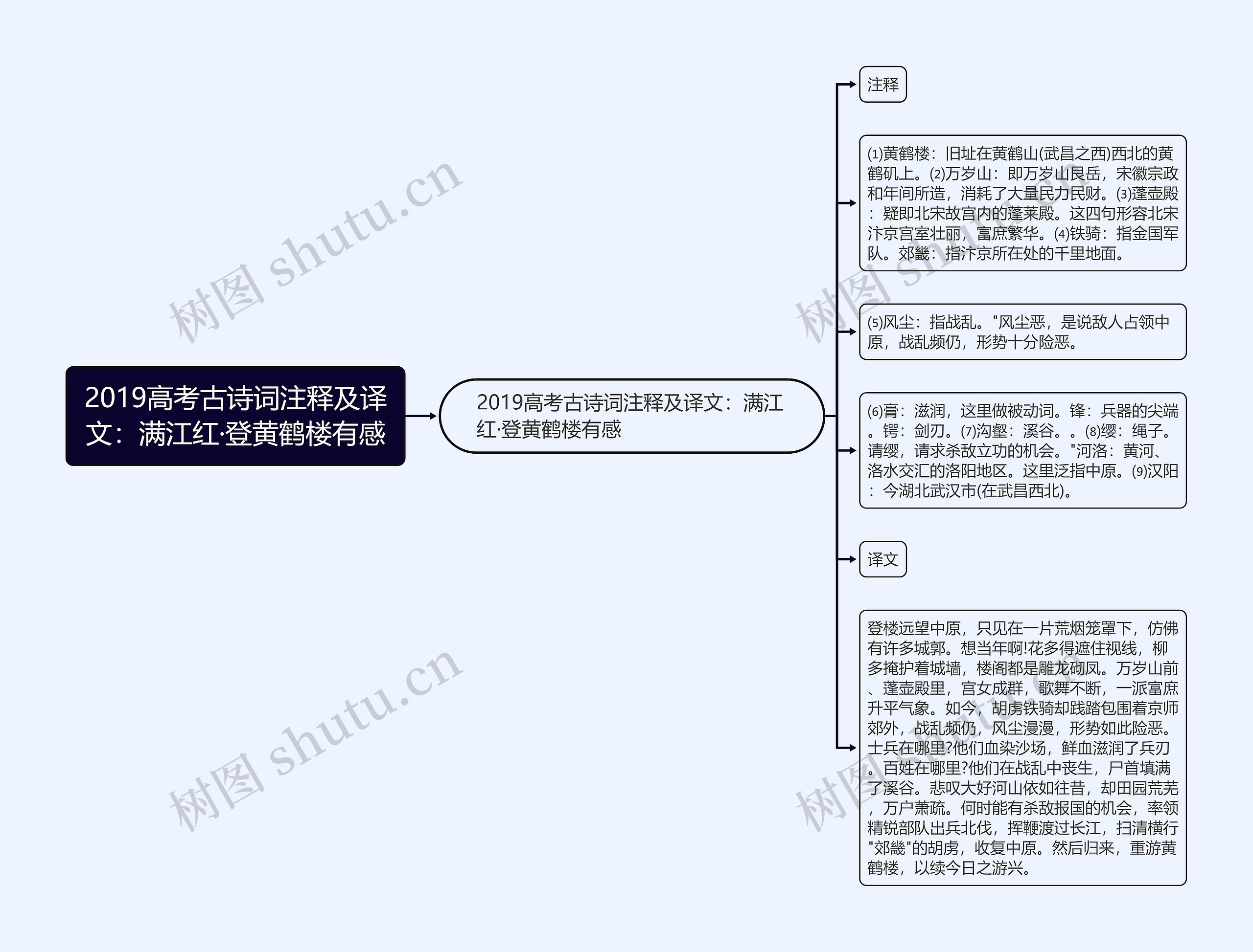 登楼远望中原,只见在一片荒烟笼罩下,仿佛有许多城郭。想当年啊!花多得遮住视线,柳多掩护着城墙,楼阁都是雕龙砌凤。万岁山前、蓬壶殿里,宫女成群,歌舞不断,一派富庶升平气象。如今,胡虏铁骑却践踏包围着京师郊外,战乱频仍,风尘漫漫,形势如此险恶。士兵在哪里?他们血染沙场,鲜血滋润了兵刃。百姓在哪里?他们在战乱中丧生,尸首填满了溪谷。悲叹大好河山依如往昔,却田园荒芜,万户萧疏。何时能有杀敌报国的机会,率领精锐部队出兵北伐,挥鞭渡过长江,扫清横行"郊畿"的胡虏,收复中原。然后归来,重游黄鹤楼,以续今日之游兴。
