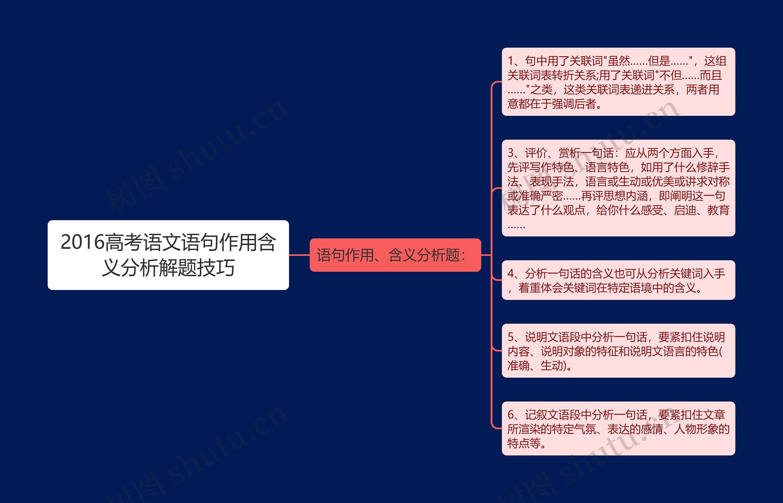 树图思维导图提供《2016高考语文语句作用含义分析解题技巧》在线思维导图免费制作,点击“编辑”按钮,可对《2016高考语文语句作用含义分析解题技巧》进行在线思维导图编辑,本思维导图属于思维导图模板主题,文件编号是:7fa93f44fd3a9a286760d578224d11d7