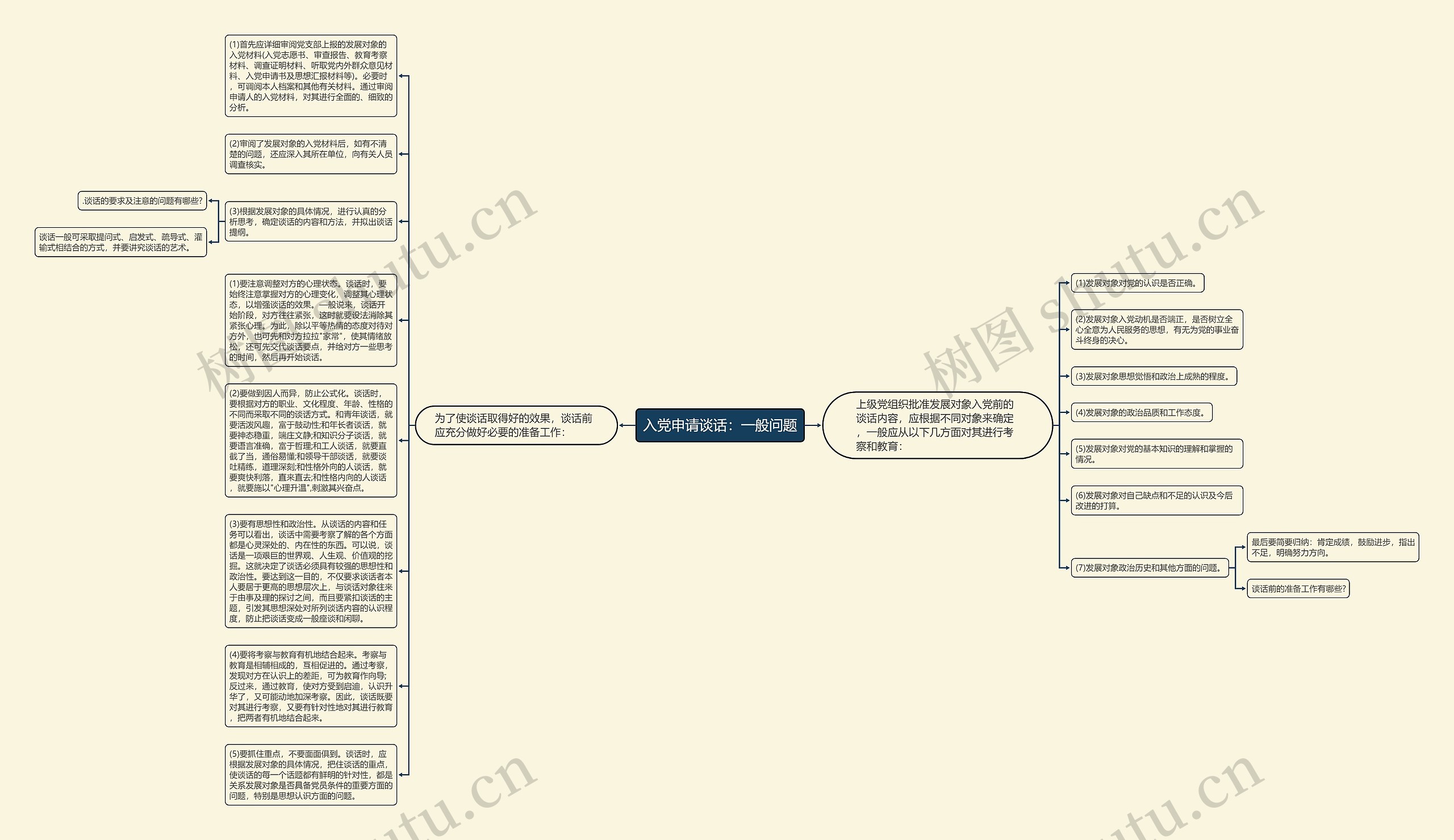 (5)要抓住重点,不要面面俱到。谈话时,应根据发展对象的具体情况,把住谈话的重点,使谈话的每一个话题都有鲜明的针对性,都是关系发展对象是否具备党员条件的重要方面的问题,特别是思想认识方面的问题。
