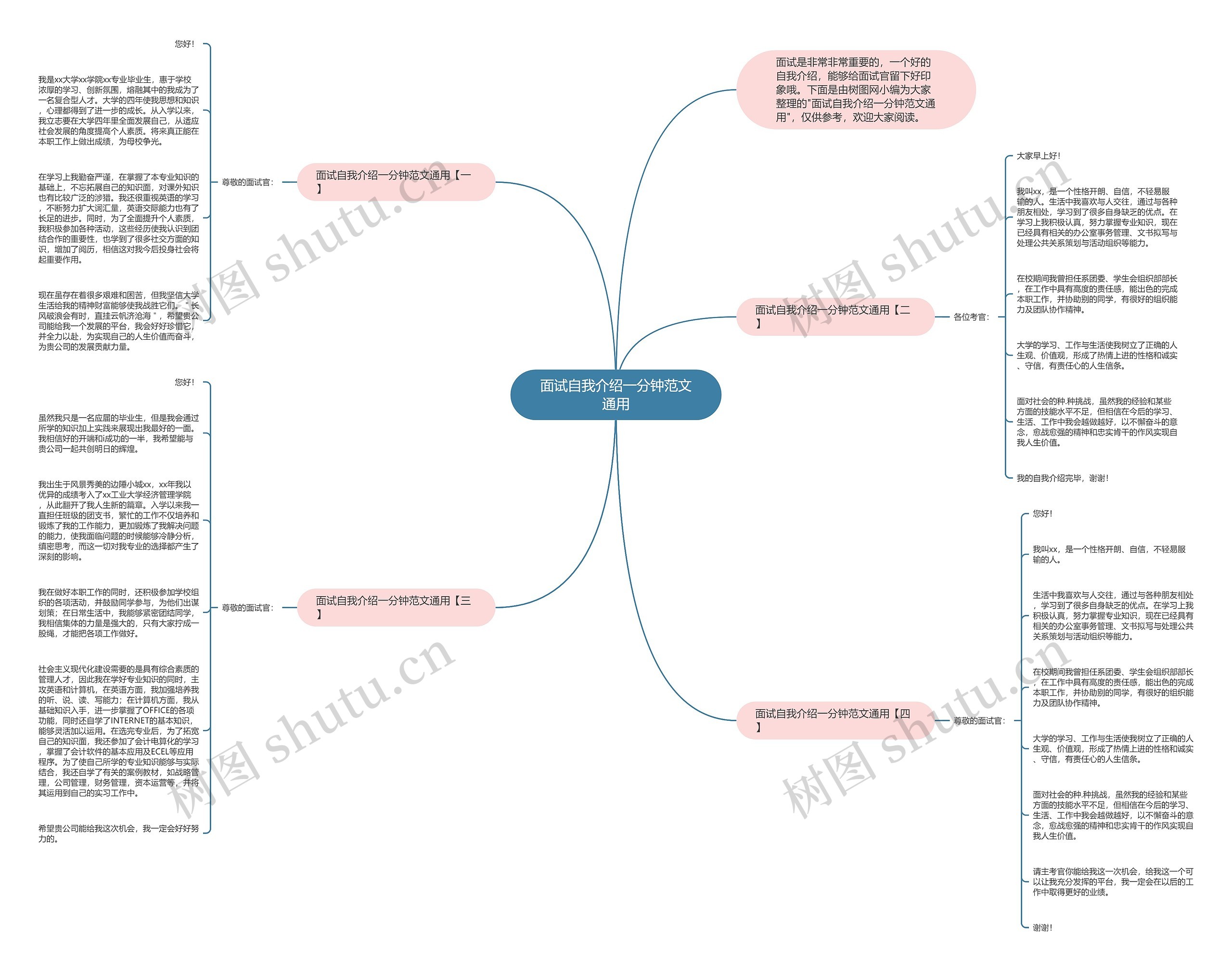 树图思维导图提供《面试自我介绍一分钟范文通用》在线思维导图免费制作,点击“编辑”按钮,可对《面试自我介绍一分钟范文通用》进行在线思维导图编辑,本思维导图属于思维导图模板主题,文件编号是:e6b3e31cc65a2e85ad58fbcad4b8daf6