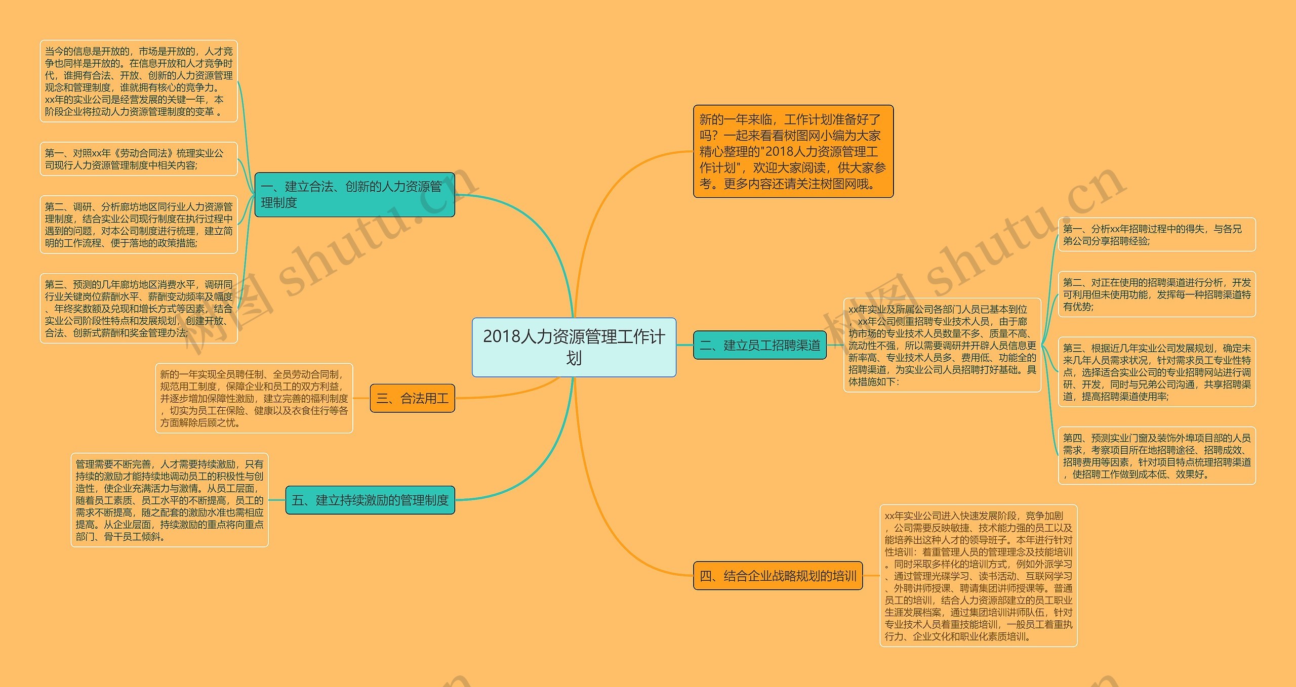 树图思维导图提供《2018人力资源管理工作计划》在线思维导图免费制作,点击“编辑”按钮,可对《2018人力资源管理工作计划》进行在线思维导图编辑,本思维导图属于思维导图模板主题,文件编号是:c1389c0b13d1a491460c0c4cfcc0e072
