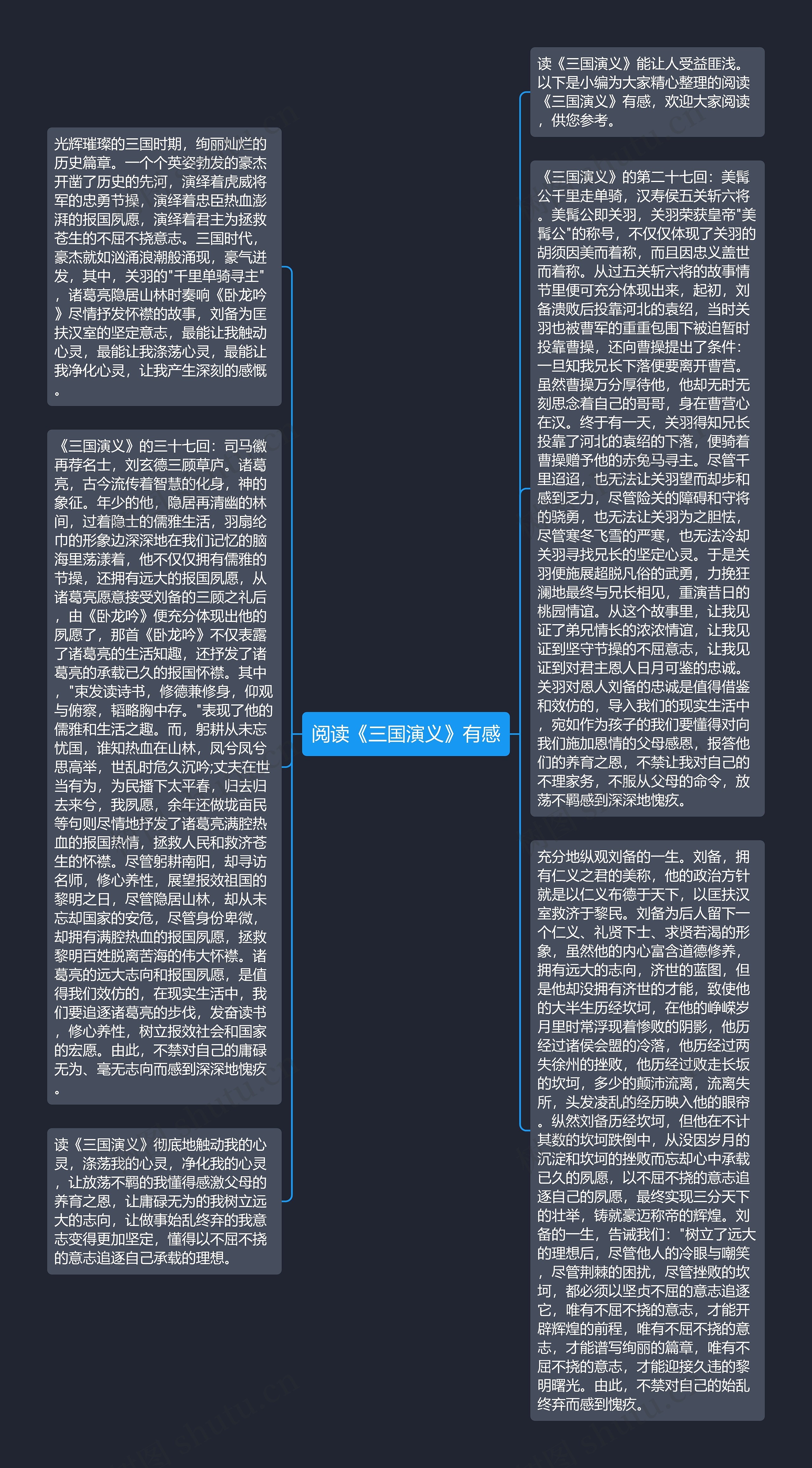 读《三国演义》彻底地触动我的心灵,涤荡我的心灵,净化我的心灵,让放荡不羁的我懂得感激父母的养育之恩,让庸碌无为的我树立远大的志向,让做事始乱终弃的我意志变得更加坚定,懂得以不屈不挠的意志追逐自己承载的理想。