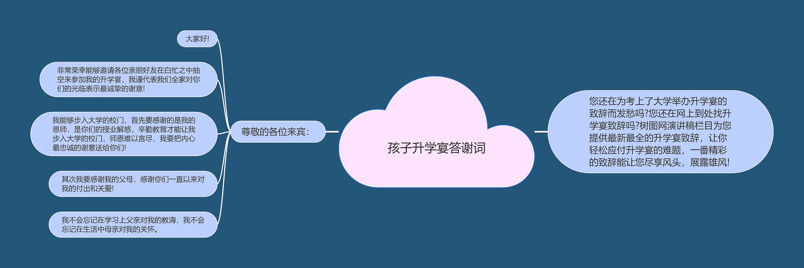 树图思维导图提供《孩子升学宴答谢词》在线思维导图免费制作,点击“编辑”按钮,可对《孩子升学宴答谢词》进行在线思维导图编辑,本思维导图属于思维导图模板主题,文件编号是:38ccaf7be38fc506cf66f8aaa7983ab6