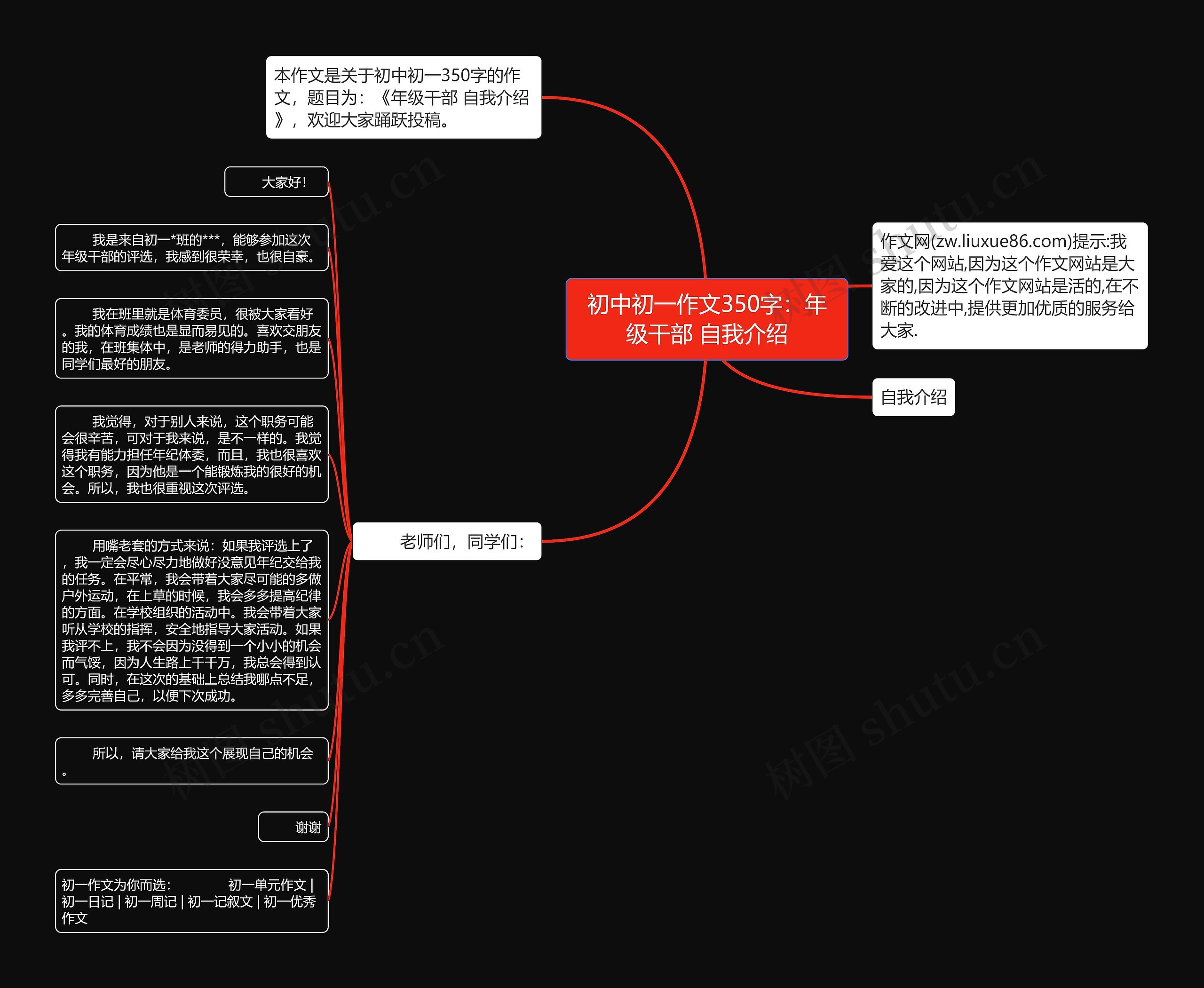 树图思维导图提供《初中初一作文350字:年级干部 自我介绍》在线思维导图免费制作,点击“编辑”按钮,可对《初中初一作文350字:年级干部 自我介绍》进行在线思维导图编辑,本思维导图属于思维导图模板主题,文件编号是:93b352e02ca5387e814b8fc3c7ce14c2