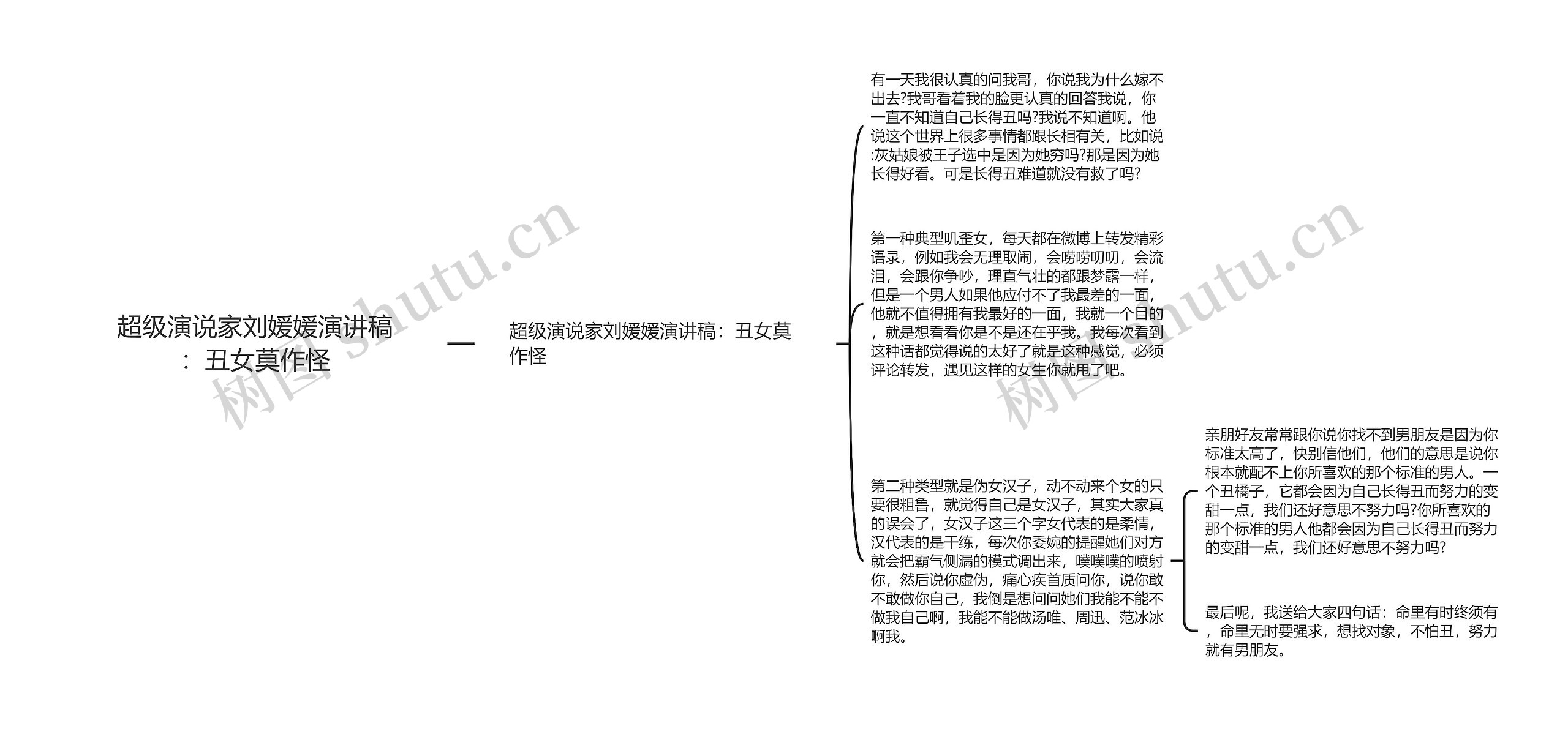 树图思维导图提供《超级演说家刘媛媛演讲稿:丑女莫作怪》在线思维导图免费制作,点击“编辑”按钮,可对《超级演说家刘媛媛演讲稿:丑女莫作怪》进行在线思维导图编辑,本思维导图属于思维导图模板主题,文件编号是:b7d498ca4e0a7821babbb8941de5f4f8