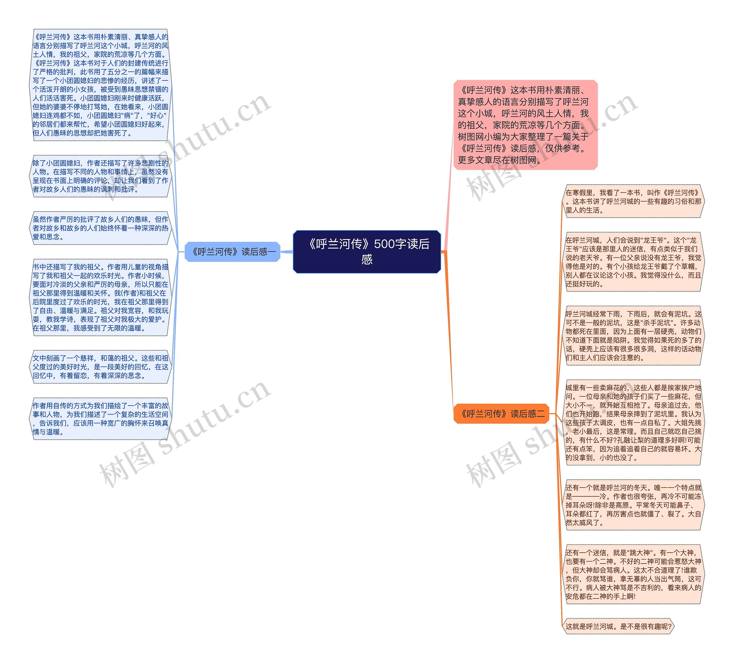 《呼兰河传》这本书用朴素清丽、真挚感人的语言分别描写了呼兰河这个小城,呼兰河的风土人情,我的祖父,家院的荒凉等几个方面。《呼兰河传》这本书对于人们的封建传统进行了严格的批判,此书用了五分之一的篇幅来描写了一个小团圆媳妇的悲惨的经历,讲述了一个活泼开朗的小女孩,被受到愚昧思想禁锢的人们活活害死。小团圆媳妇刚来时健康活跃,但她的婆婆不停地打骂她,在她看来,小团圆媳妇连鸡都不如,小团圆媳妇"病"了,"好心"的邻居们都来帮忙,希望小团圆媳妇好起来,但人们愚昧的思想却把她害死了。