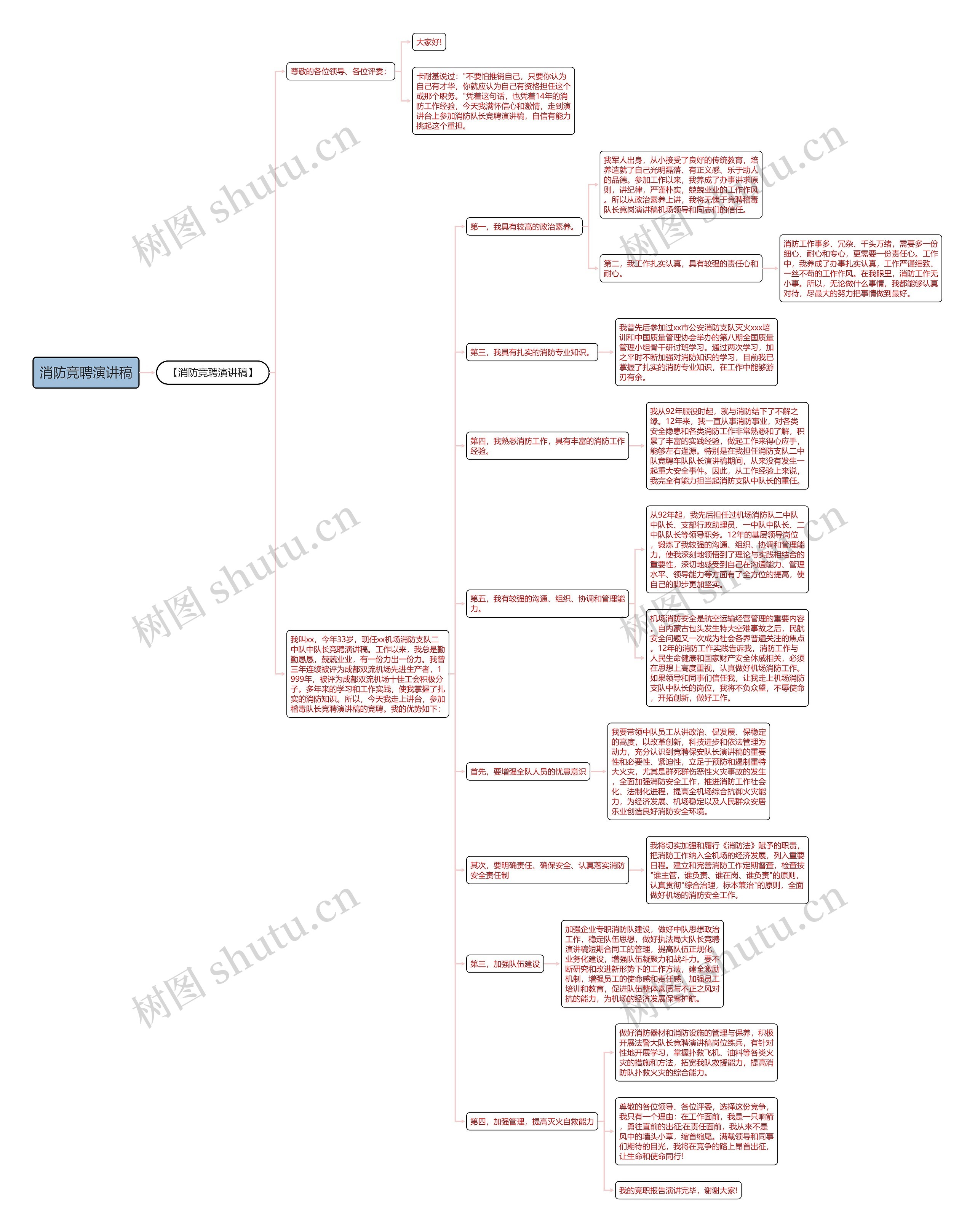 树图思维导图提供《消防竞聘演讲稿》在线思维导图免费制作,点击“编辑”按钮,可对《消防竞聘演讲稿》进行在线思维导图编辑,本思维导图属于思维导图模板主题,文件编号是:327ffa77d9824773c758812bcb4437b7