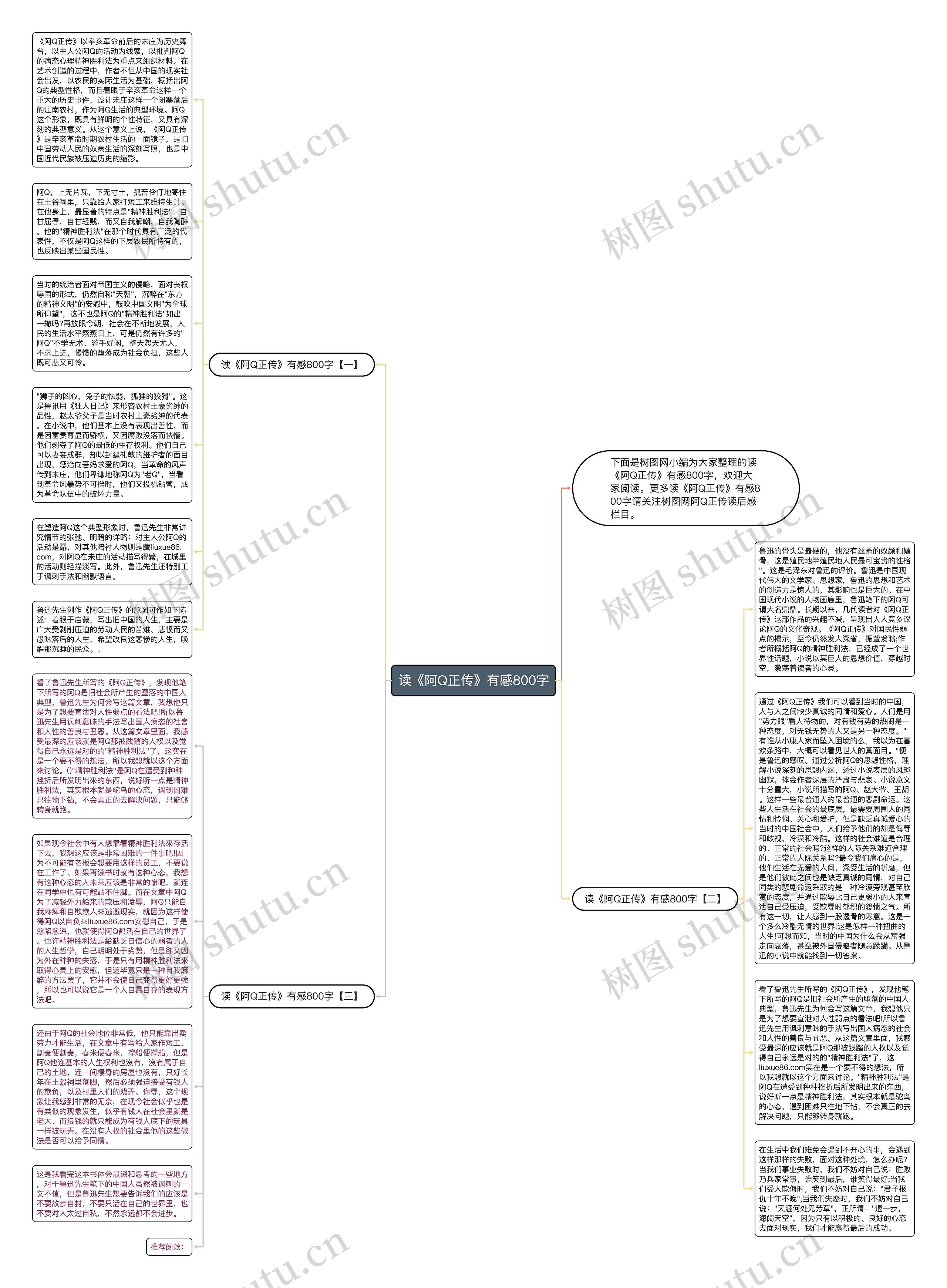《阿Q正传》以辛亥革命前后的未庄为历史舞台,以主人公阿Q的活动为线索,以批判阿Q的病态心理精神胜利法为重点来组织材料。在艺术创造的过程中,作者不但从中国的现实社会出发,以农民的实际生活为基础,概括出阿Q的典型性格,而且着眼于辛亥革命这样一个重大的历史事件,设计未庄这样一个闭塞落后的江南农村,作为阿Q生活的典型环境。阿Q这个形象,既具有鲜明的个性特征,又具有深刻的典型意义。从这个意义上说,《阿Q正传》是辛亥革命时期农村生活的一面镜子,是旧中国劳动人民的奴隶生活的深刻写照,也是中国近代民族被压迫历史的缩影。