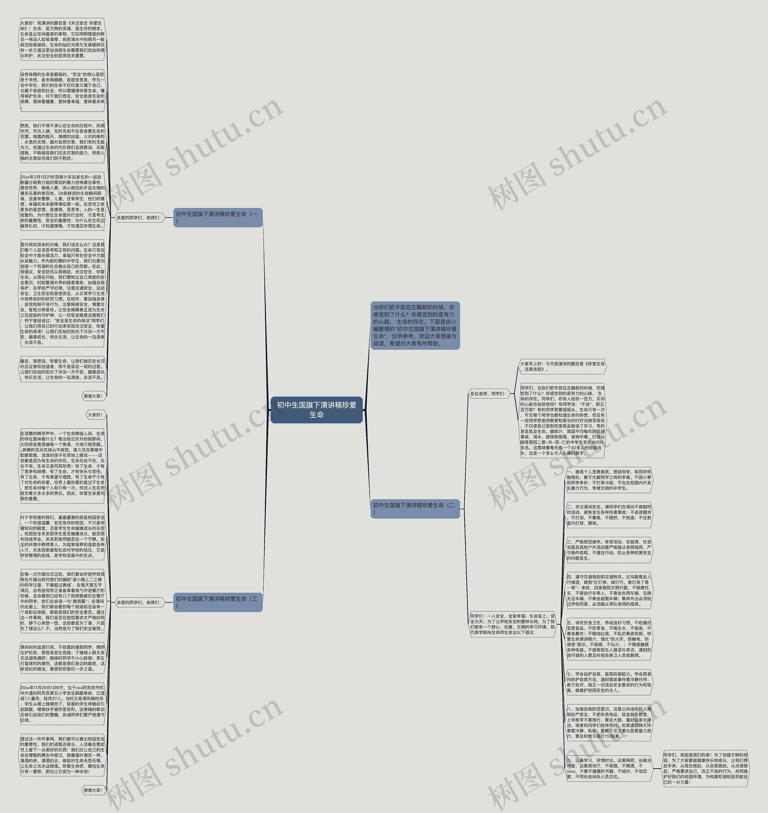 五、讲究饮食卫生,养成良好习惯。不吃腐烂变质食品,不吃零食,不喝生水,不偏食,不暴食暴饮;不随地吐痰,不乱扔果皮纸屑。珍爱生命演讲稿六、强化"防火灾、防触电、防侵害"意识。不吸烟、不玩火,;不随意触摸各种电器。不接受陌生人接送与来访,遇到形迹可疑的人要及时报告保卫人员或教师。