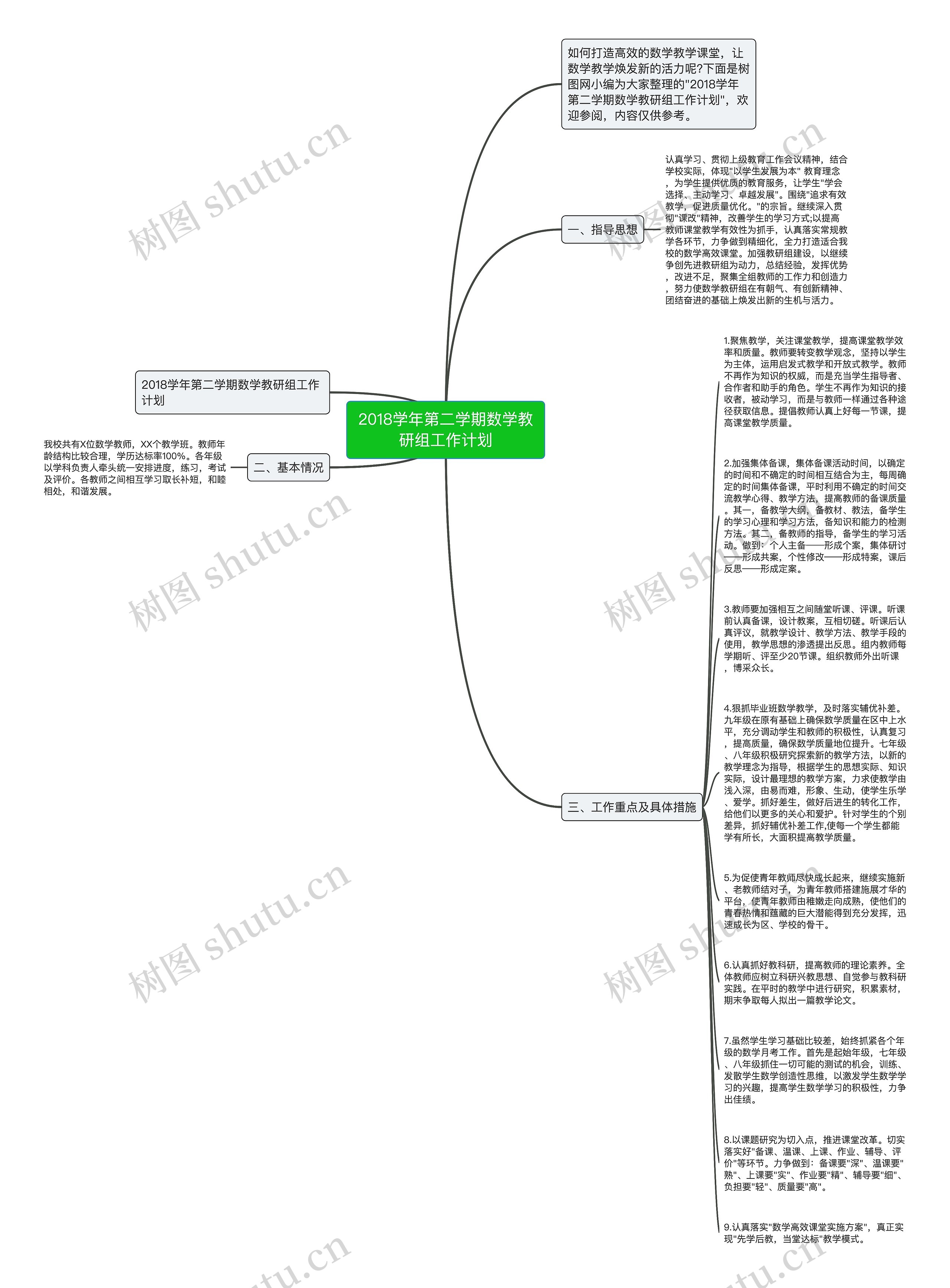 2018学年第二学期数学教研组工作计划思维导图包含以下知识点:1.指导思想:以学生发展为本,追求有效教学,促进质量优化,持续深化课程改革,提高教师的教学效果,加强教研组建设。