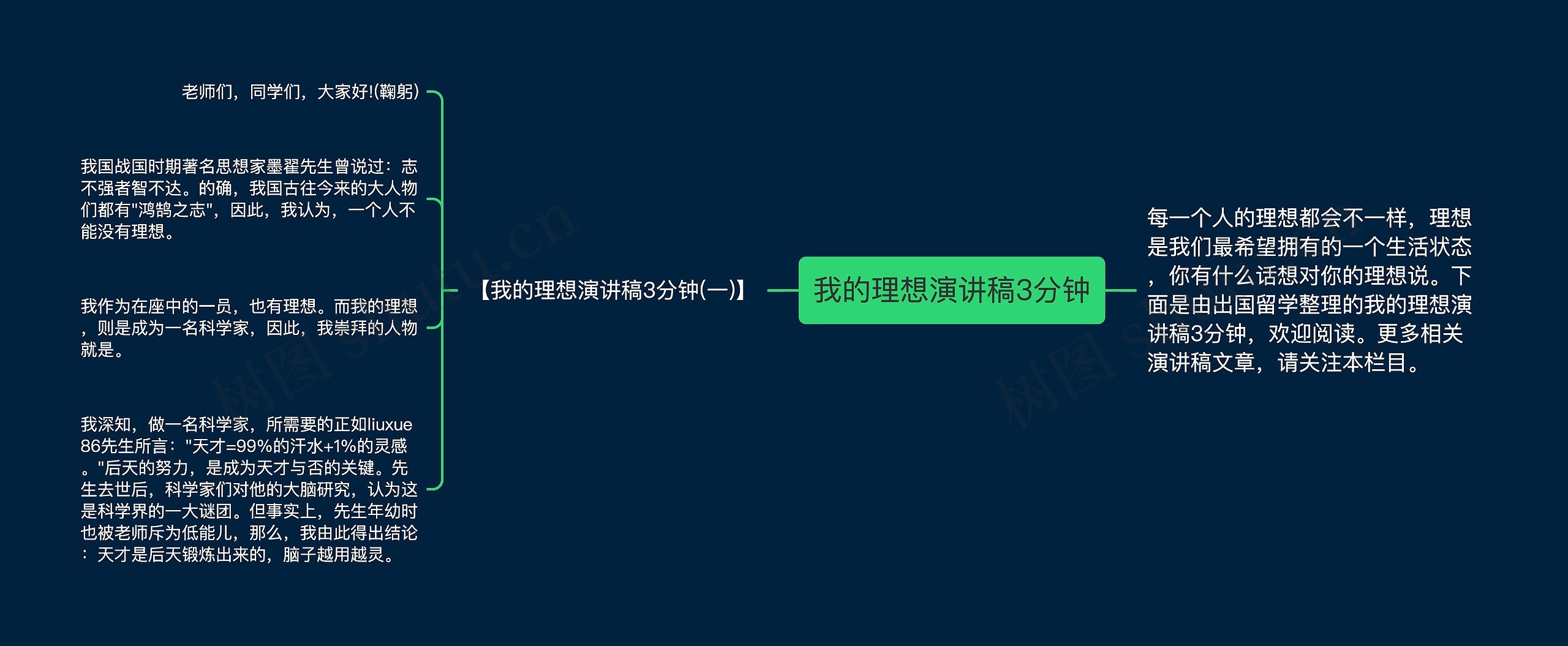 树图思维导图提供《我的理想演讲稿3分钟》在线思维导图免费制作,点击“编辑”按钮,可对《我的理想演讲稿3分钟》进行在线思维导图编辑,本思维导图属于思维导图模板主题,文件编号是:d08dab28be9a15eb77b935ccc7e15eba