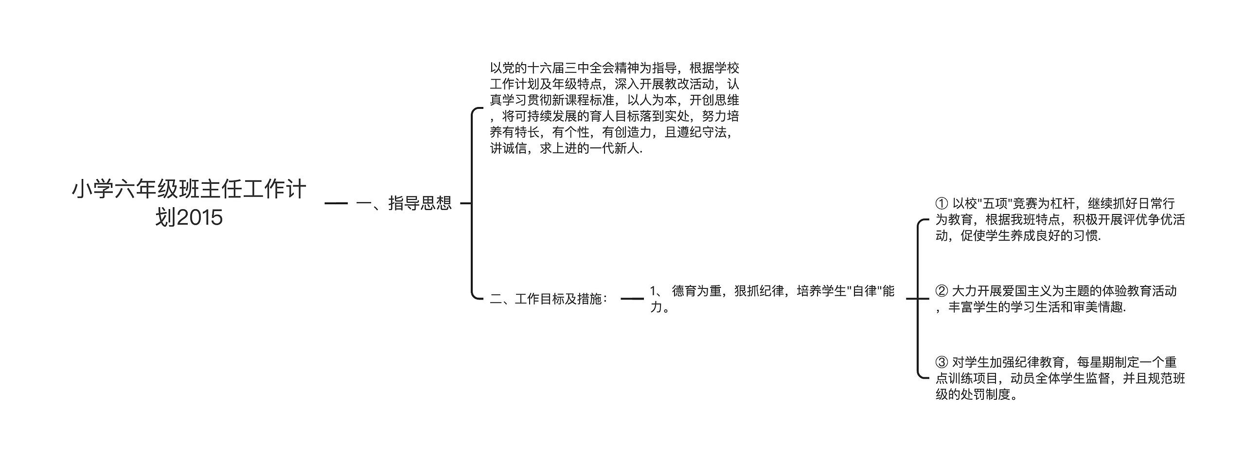 树图思维导图提供《小学六年级班主任工作计划2015》在线思维导图免费制作,点击“编辑”按钮,可对《小学六年级班主任工作计划2015》进行在线思维导图编辑,本思维导图属于思维导图模板主题,文件编号是:e5aa7811e0f2b45b6b9f1a268203acbf