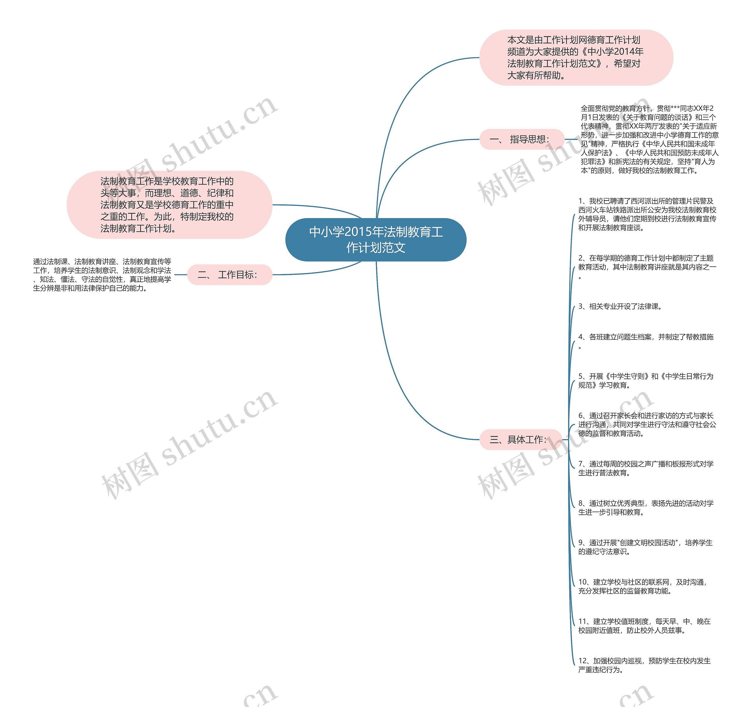 树图思维导图提供《中小学2015年法制教育工作计划范文》在线思维导图免费制作,点击“编辑”按钮,可对《中小学2015年法制教育工作计划范文》进行在线思维导图编辑,本思维导图属于思维导图模板主题,文件编号是:83334161e3798bace47b656976738824