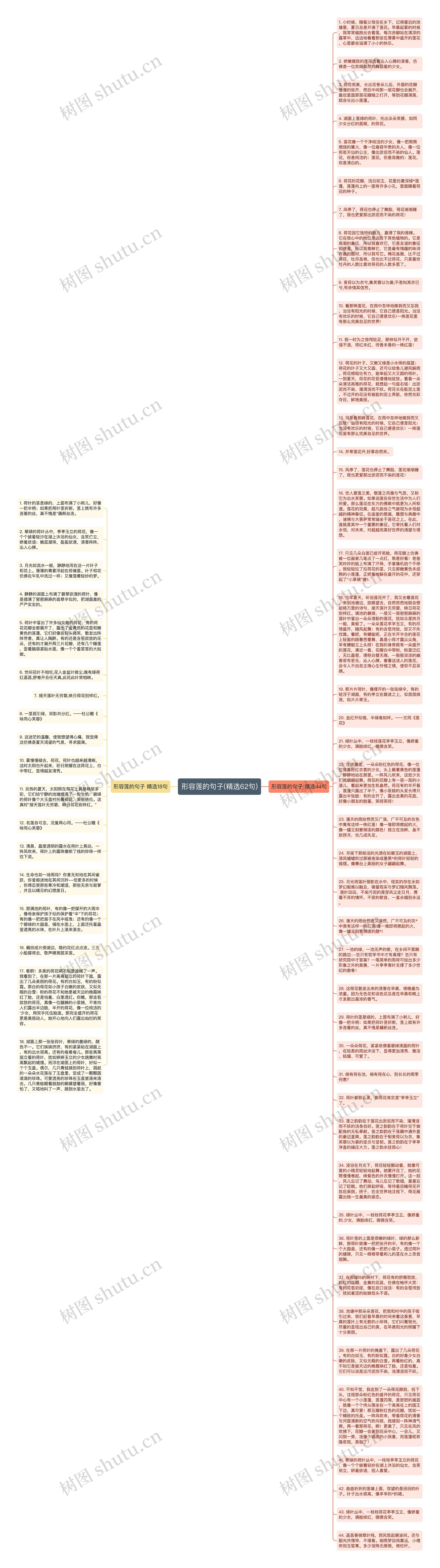 43. 绿叶丛中,一枝枝荷花亭亭玉立,像娇羞的少女,满脸绯红,微微含笑。