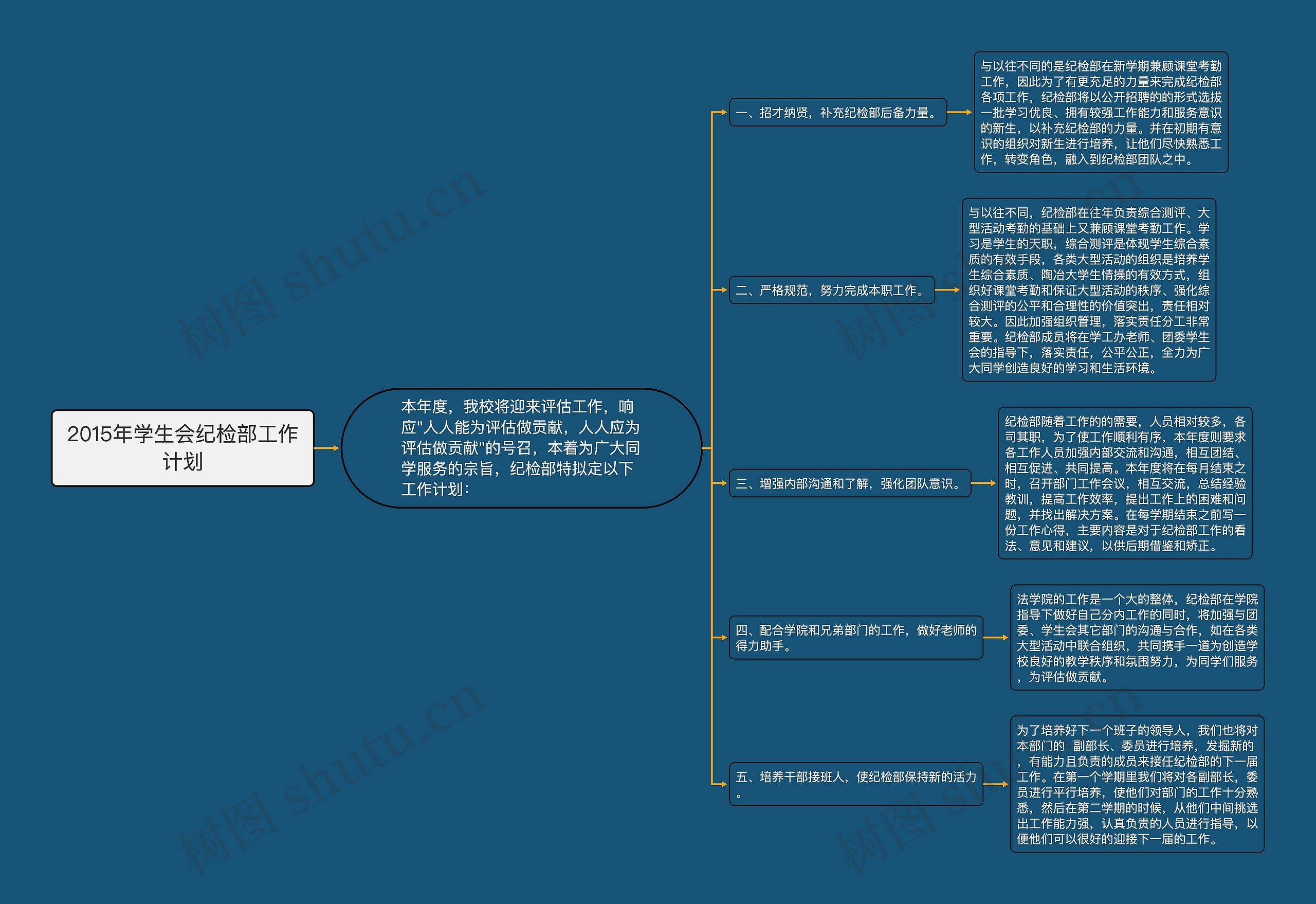 树图思维导图提供《2015年学生会纪检部工作计划》在线思维导图免费制作,点击“编辑”按钮,可对《2015年学生会纪检部工作计划》进行在线思维导图编辑,本思维导图属于思维导图模板主题,文件编号是:22f879815f854da5ec23ac8f62f07907