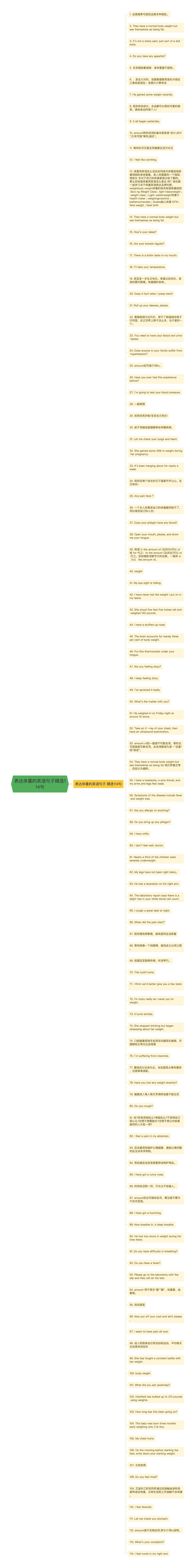 13. 体重用英语怎么说及如何造句体重是指称量得到的身体重量,是人体重量的一个指标,相信女 生对于自己的体重都是比较了解的。那么你知道体重用英语怎么表达 吗?现在跟 一起学习关于体重英语表达及例句吧。weightbody weight体重的相关短语体重级别 Boxi ng Weight Class ; light heavyweight ; weight class ; Light-welterweight体重计 Health meter ; weighingmachine ; batheroomscales ; Scales胎儿体重 EFW ; fetal weight ; fetal birth