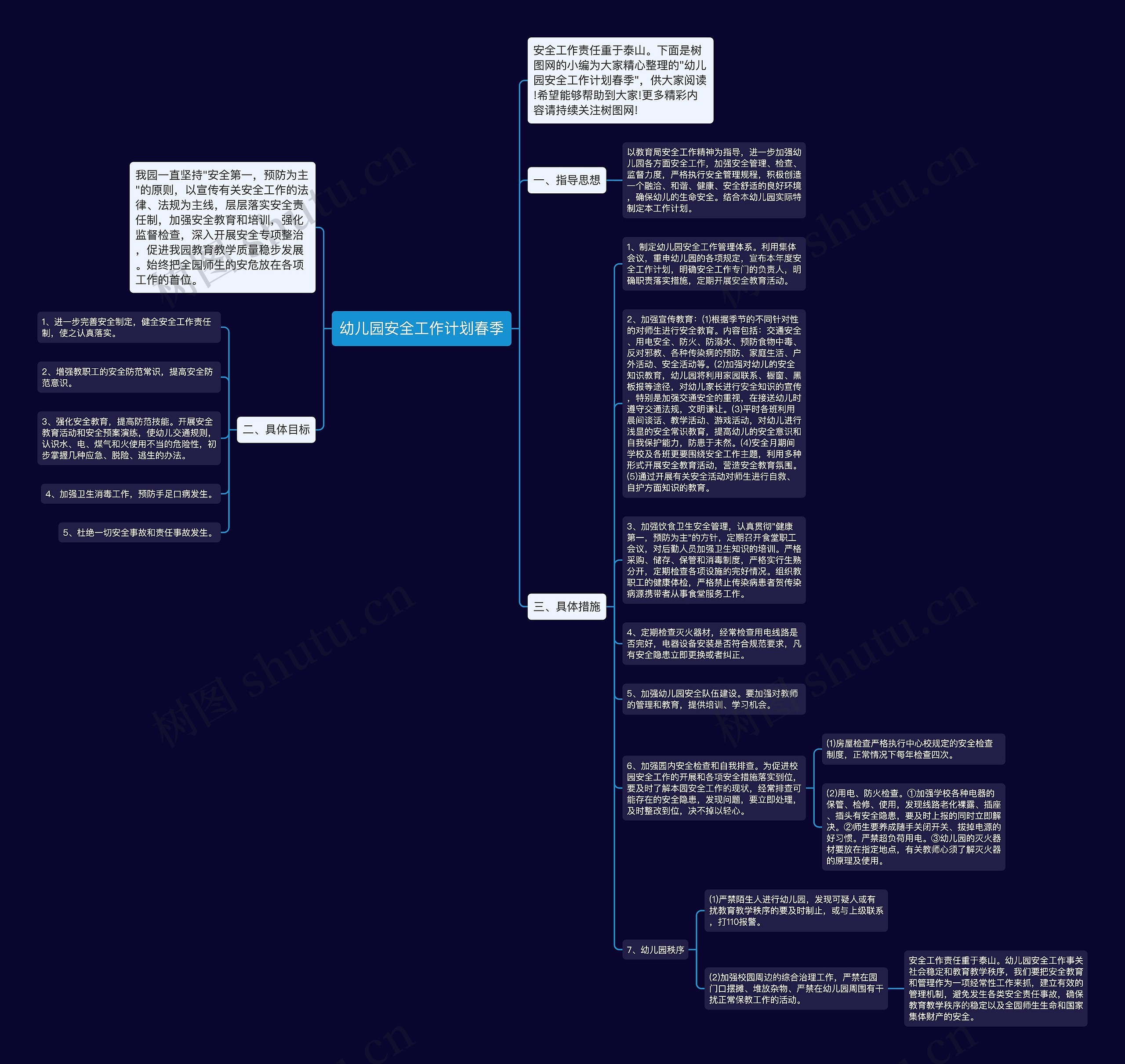 1、制定幼儿园安全工作管理体系。利用集体会议,重申幼儿园的各项规定,宣布本年度安全工作计划,明确安全工作专门的负责人,明确职责落实措施,定期开展安全教育活动。