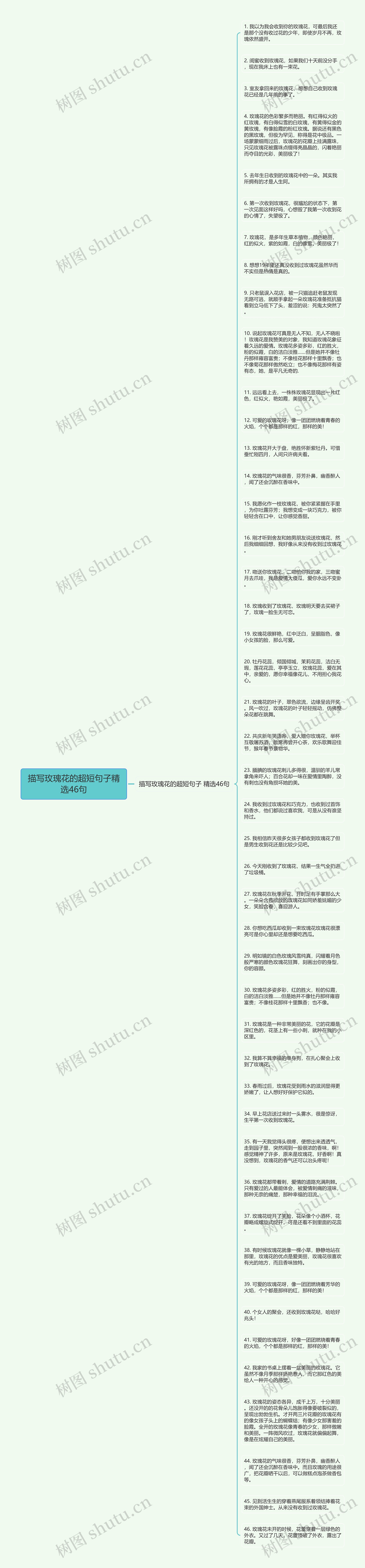 43. 玫瑰花的姿态各异,成千上万,十分美丽。还没开的的花骨朵儿饱胀得像要破裂似的,呈现出勃勃生机。才开两三片花瓣的玫瑰花有的像女孩子头上的蝴蝶结;有像少女那害羞的脸霞。全开的玫瑰花像青春的少女,那样傲嫩和美丽。一阵微风吹过,玫瑰花就偏偏起舞,像是在炫耀自己的美丽。