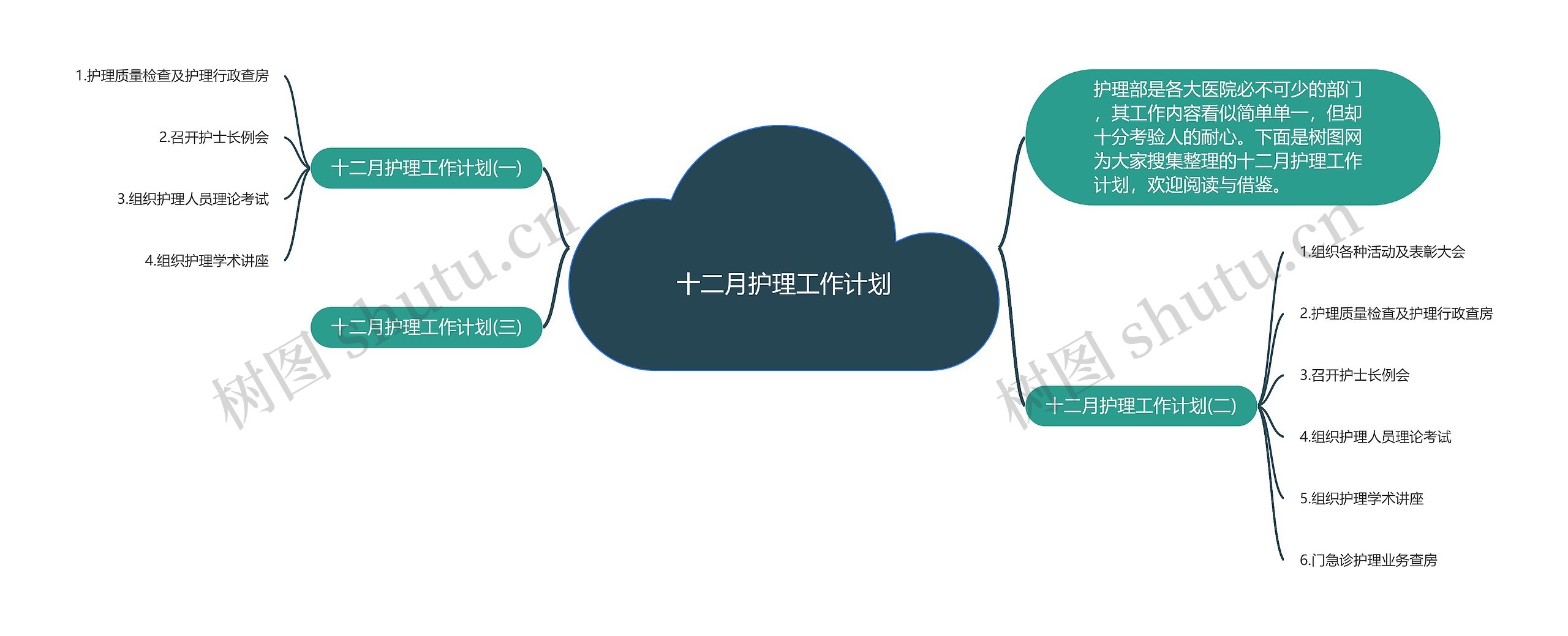 树图思维导图提供《十二月护理工作计划》在线思维导图免费制作,点击“编辑”按钮,可对《十二月护理工作计划》进行在线思维导图编辑,本思维导图属于思维导图模板主题,文件编号是:90b1f170b0664c9f175e16348cb5b1ca