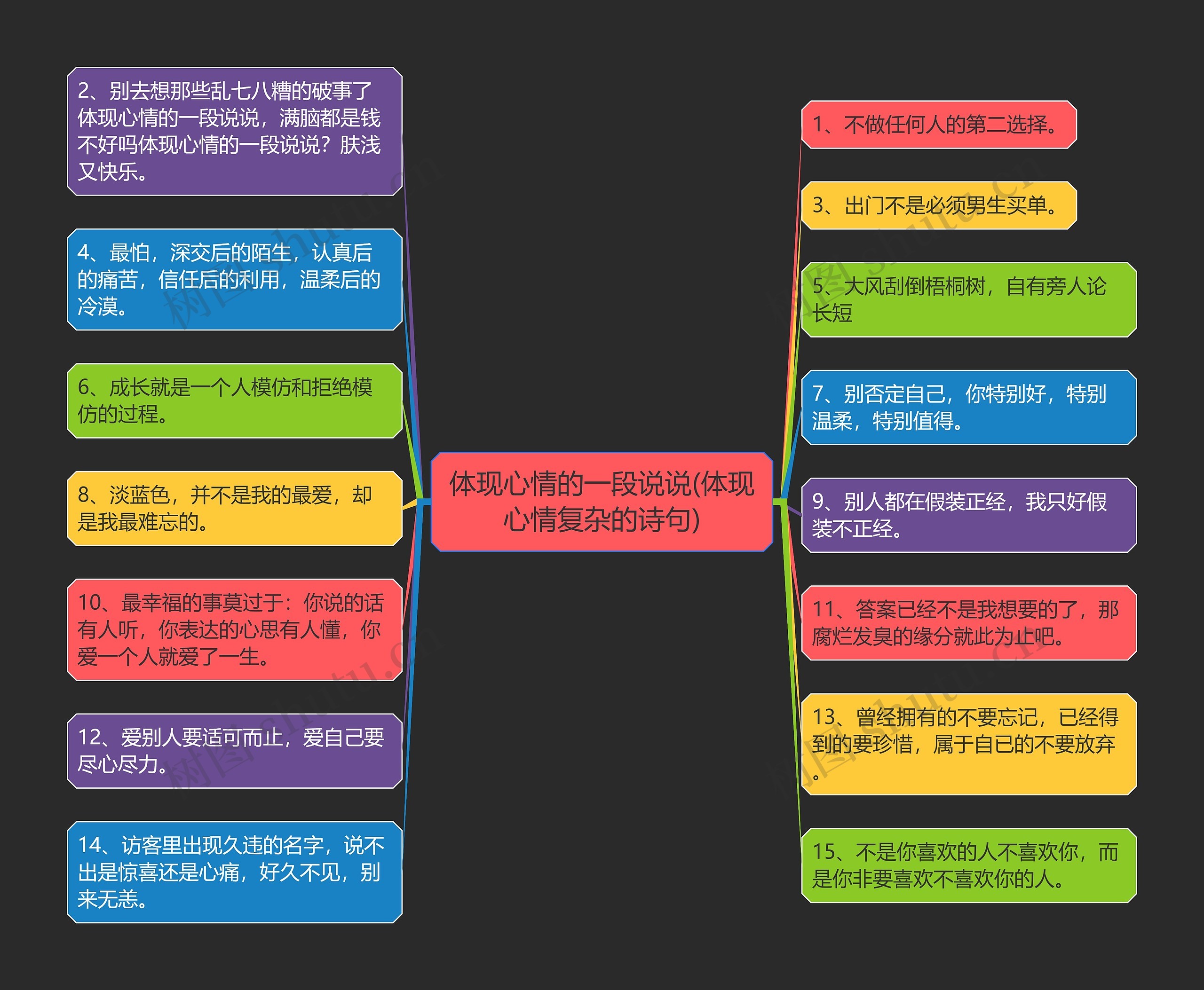 树图思维导图提供《体现心情的一段说说(体现心情复杂的诗句)》在线思维导图免费制作,点击“编辑”按钮,可对《体现心情的一段说说(体现心情复杂的诗句)》进行在线思维导图编辑,本思维导图属于思维导图模板主题,文件编号是:8f9b2642912291a509fac082638b9dcd