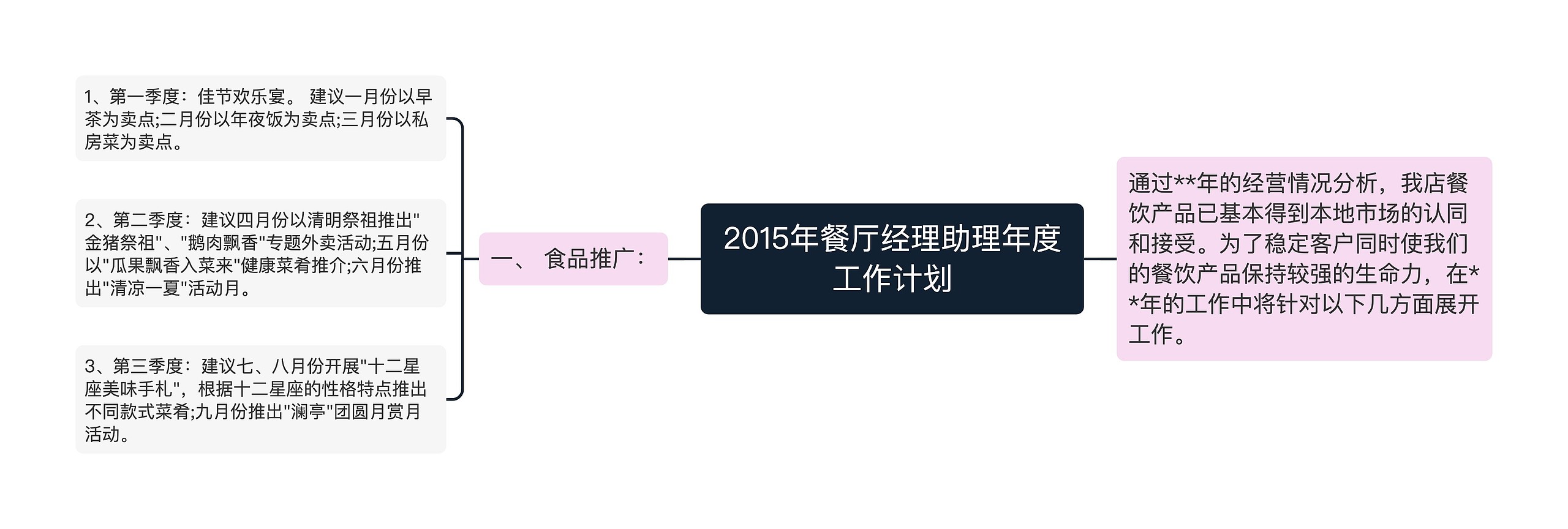 树图思维导图提供《2015年餐厅经理助理年度工作计划》在线思维导图免费制作,点击“编辑”按钮,可对《2015年餐厅经理助理年度工作计划》进行在线思维导图编辑,本思维导图属于思维导图模板主题,文件编号是:ca8ef6e0c291ff71c2c670eb21edabf1