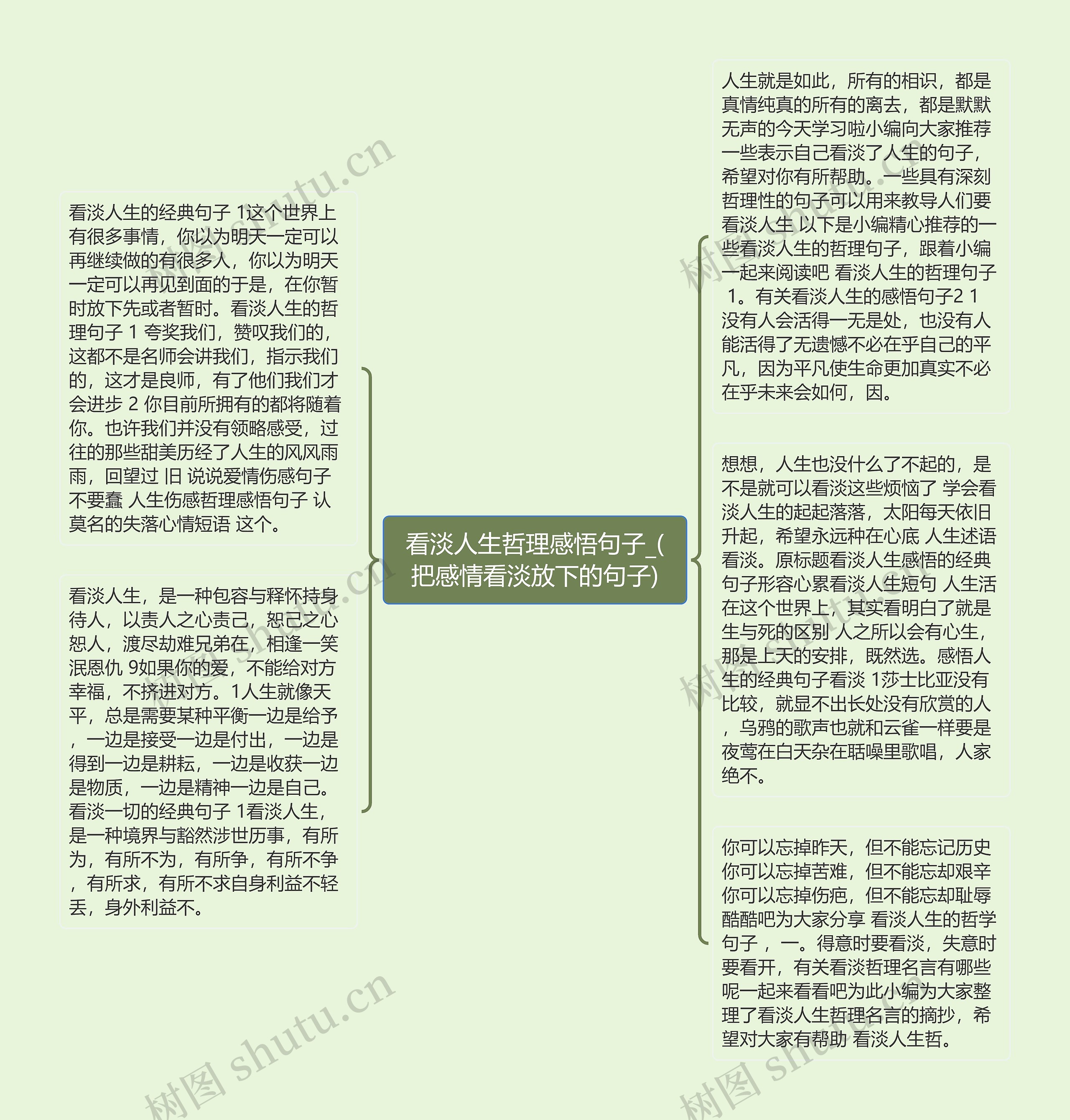 人生就是如此,所有的相识,都是真情纯真的所有的离去,都是默默无声的今天学习啦小编向大家推荐一些表示自己看淡了人生的句子,希望对你有所帮助。一些具有深刻哲理性的句子可以用来教导人们要看淡人生 以下是小编精心推荐的一些看淡人生的哲理句子,跟着小编一起来阅读吧 看淡人生的哲理句子 1。有关看淡人生的感悟句子2 1 没有人会活得一无是处,也没有人能活得了无遗憾不必在乎自己的平凡,因为平凡使生命更加真实不必在乎未来会如何,因。