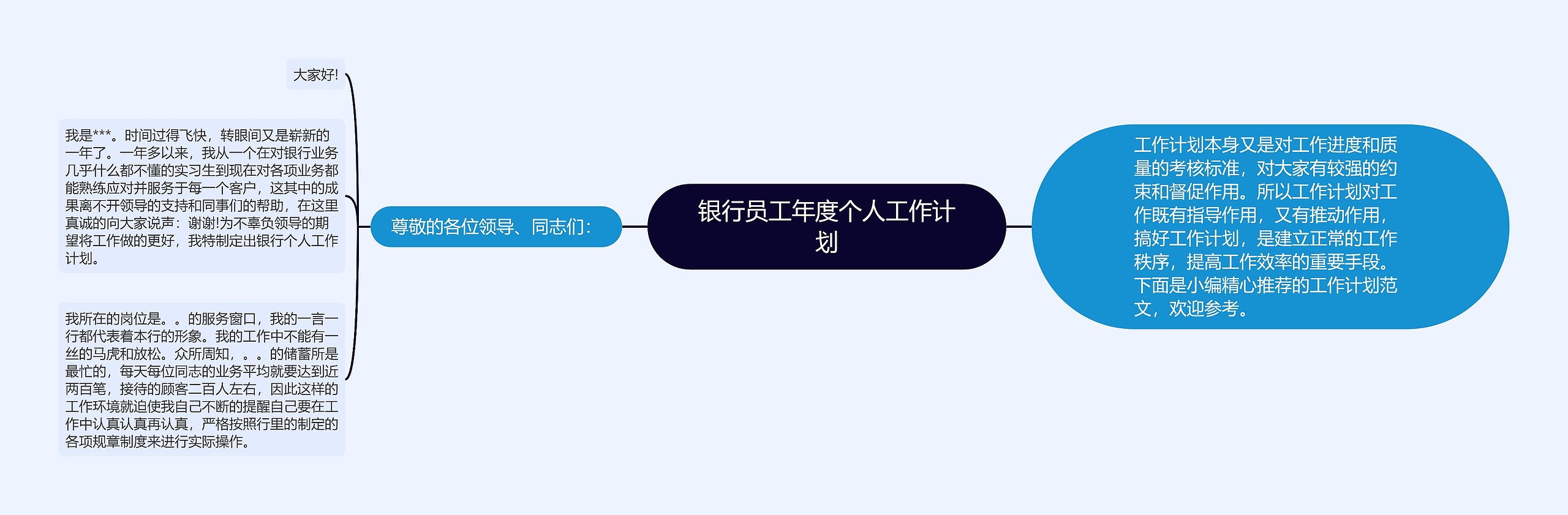 树图思维导图提供《银行员工年度个人工作计划》在线思维导图免费制作,点击“编辑”按钮,可对《银行员工年度个人工作计划》进行在线思维导图编辑,本思维导图属于思维导图模板主题,文件编号是:1d7ce128b124933230563c408b78ffba