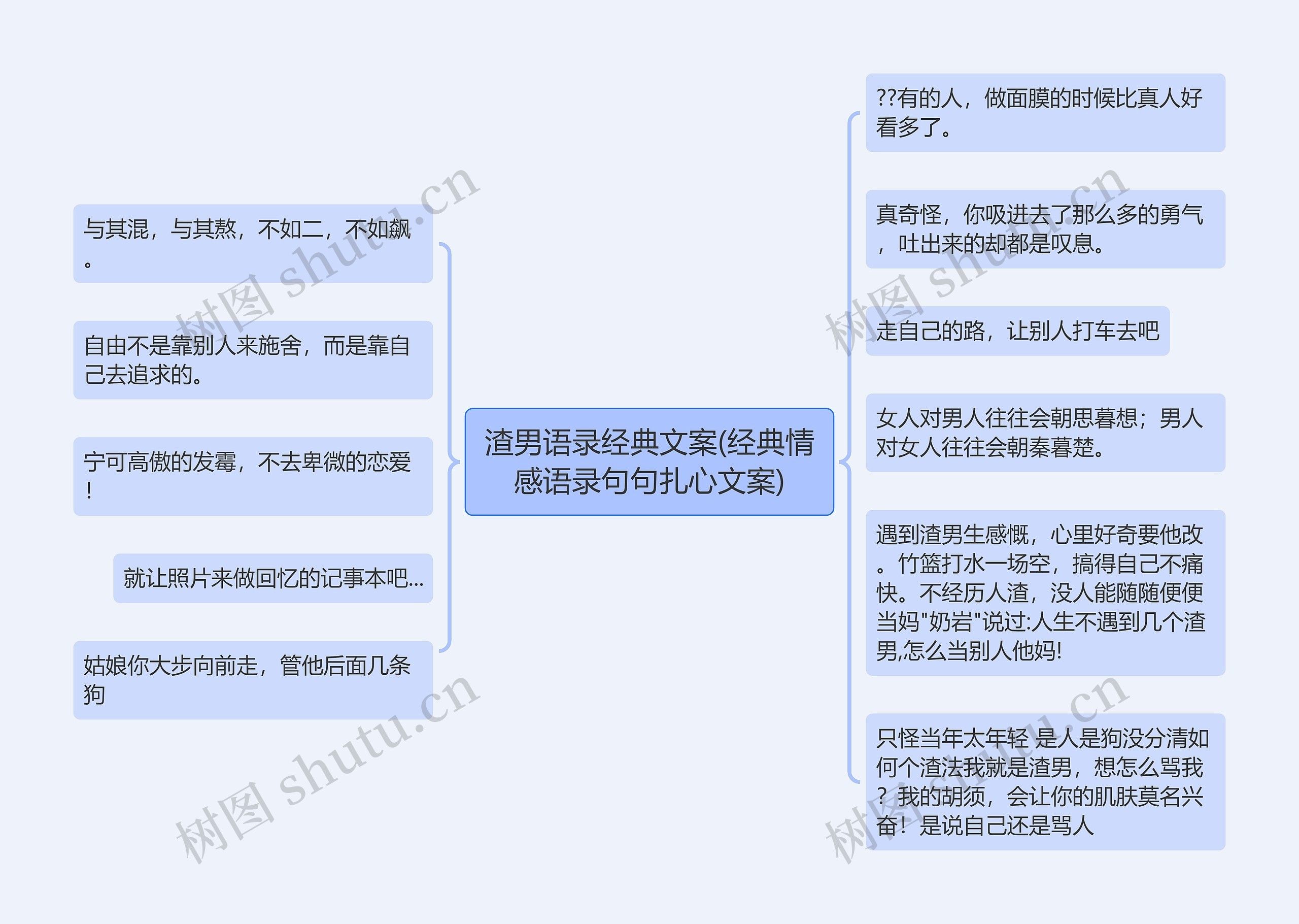 树图思维导图提供《渣男语录经典文案(经典情感语录句句扎心文案)》在线思维导图免费制作,点击“编辑”按钮,可对《渣男语录经典文案(经典情感语录句句扎心文案)》进行在线思维导图编辑,本思维导图属于思维导图模板主题,文件编号是:ba4770e6a131ae2e8cacb54cd5090ce7