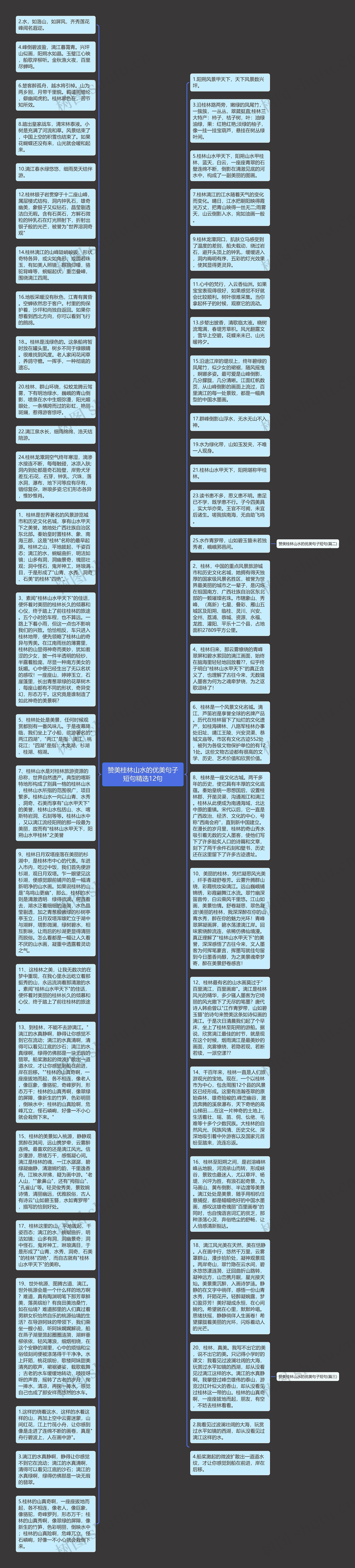 20、桂林,真美。我写不出它的美,说不出它的美。只记得小学时的课文:我看见过波澜壮阔的大海,玩赏过水平如镜的西湖,却从没看见过漓江这样的水。漓江的水真静啊。我攀登过峰峦雄伟的泰山,游览过红叶似火的香山,却从没看见过桂林这一带的山。桂林的山真奇啊,一座座拔地而起,朋友,有空,不妨去桂林看看。