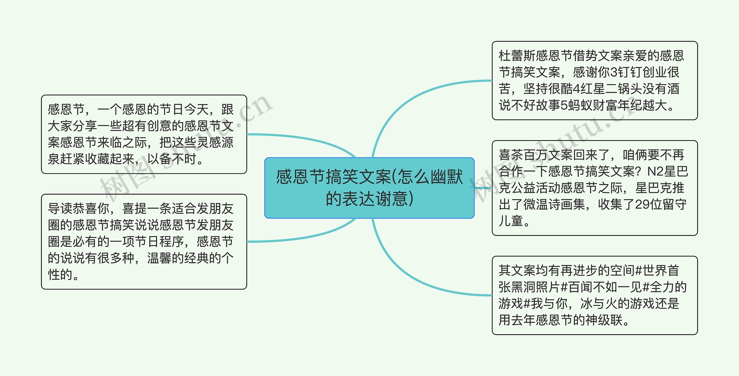 树图思维导图提供《感恩节搞笑文案(怎么幽默的表达谢意)》在线思维导图免费制作,点击“编辑”按钮,可对《感恩节搞笑文案(怎么幽默的表达谢意)》进行在线思维导图编辑,本思维导图属于思维导图模板主题,文件编号是:45a9dd51b9ea677606d630ad1bdc8280