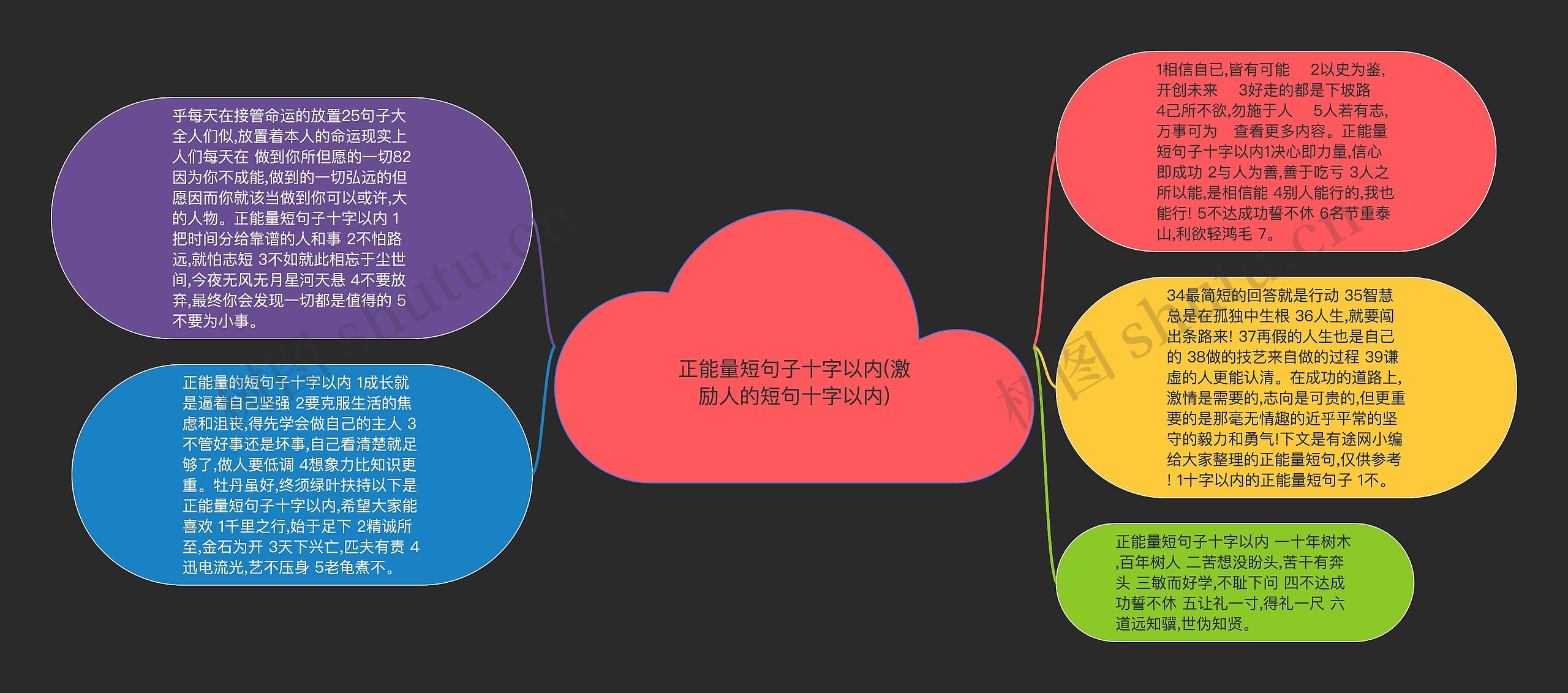 1相信自已,皆有可能 2以史为鉴,开创未来 3好走的都是下坡路 4己所不欲,勿施于人 5人若有志,万事可为 查看更多内容。正能量短句子十字以内1决心即力量,信心即成功 2与人为善,善于吃亏 3人之所以能,是相信能 4别人能行的,我也能行! 5不达成功誓不休 6名节重泰山,利欲轻鸿毛 7。