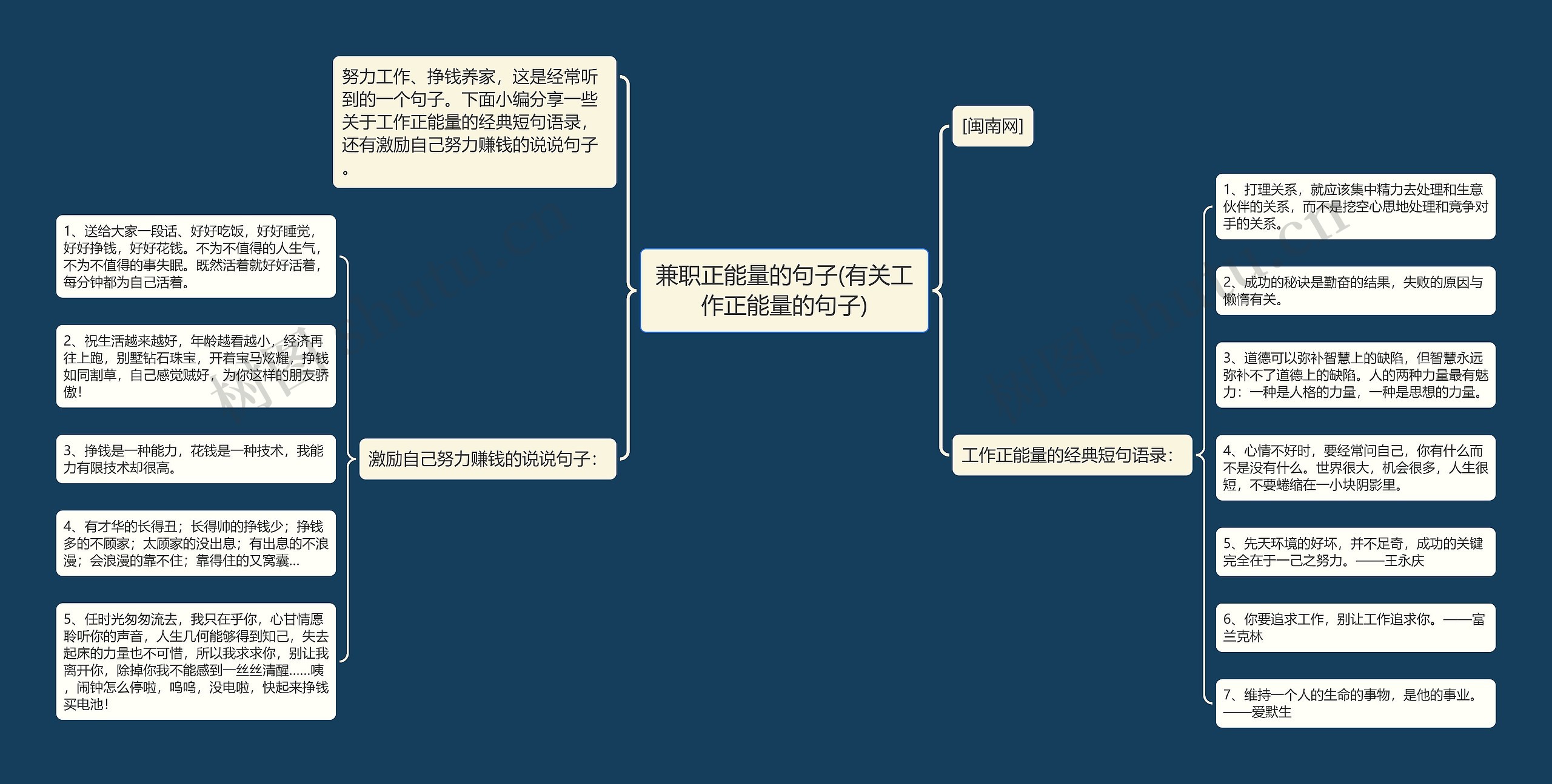 树图思维导图提供《兼职正能量的句子(有关工作正能量的句子)》在线思维导图免费制作,点击“编辑”按钮,可对《兼职正能量的句子(有关工作正能量的句子)》进行在线思维导图编辑,本思维导图属于思维导图模板主题,文件编号是:46071d25ee55751716c454b31969a611
