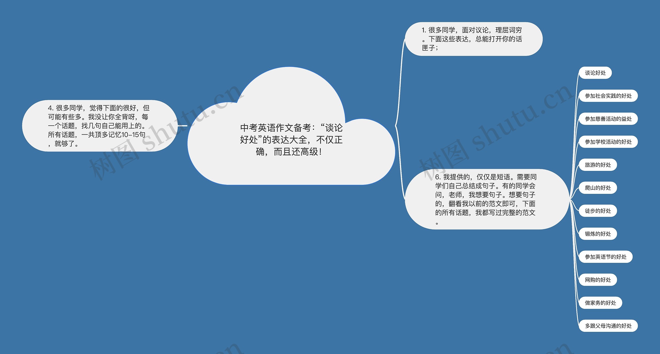 树图思维导图提供《中考英语作文备考:“谈论好处”的表达大全,不仅正确,而且还高级!》在线思维导图免费制作,点击“编辑”按钮,可对《中考英语作文备考:“谈论好处”的表达大全,不仅正确,而且还高级!》进行在线思维导图编辑,本思维导图属于思维导图模板主题,文件编号是:22f909e6420dae0aa08da4d0ff66fa82
