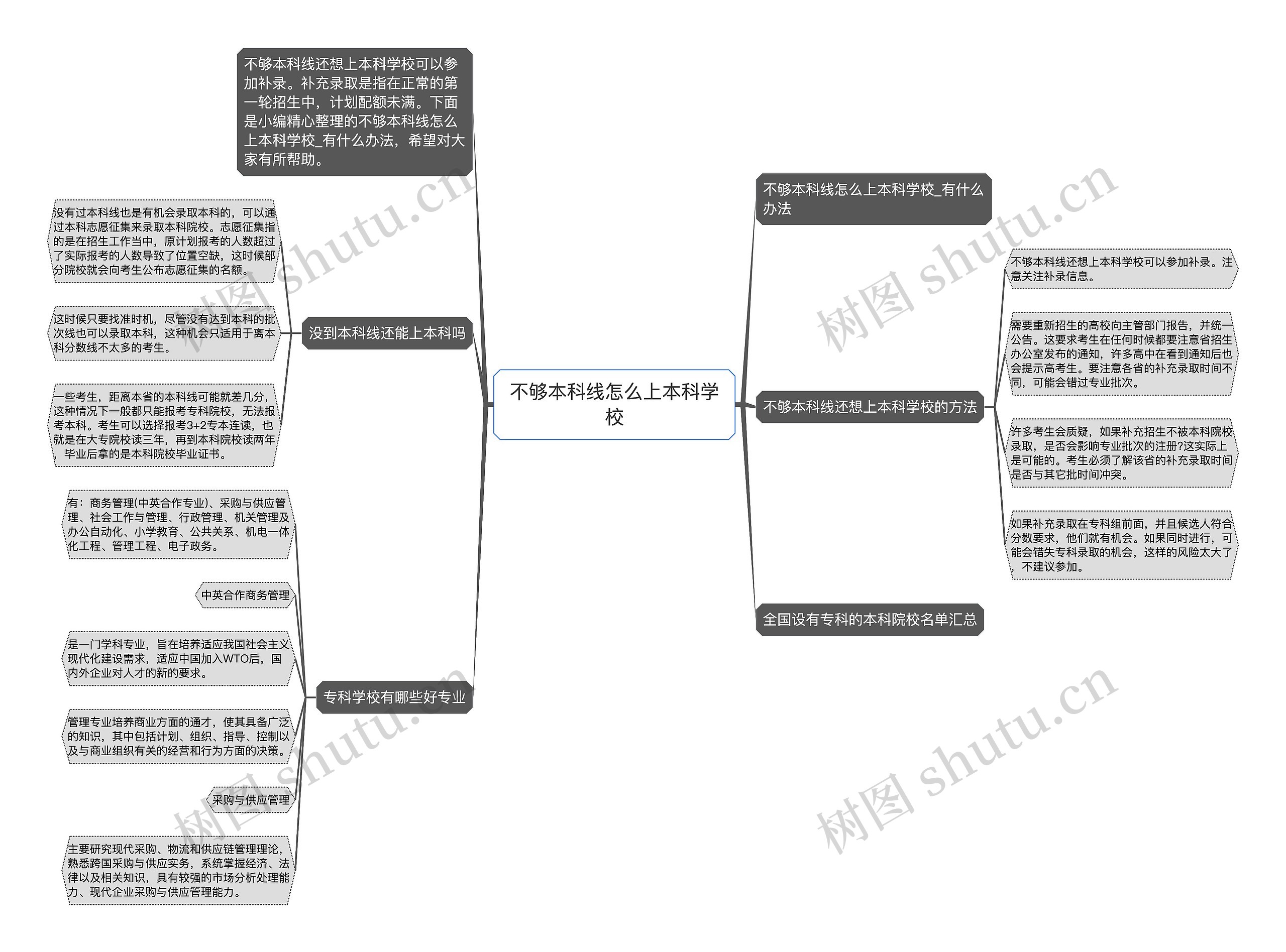 树图思维导图提供《不够本科线怎么上本科学校》在线思维导图免费制作,点击“编辑”按钮,可对《不够本科线怎么上本科学校》进行在线思维导图编辑,本思维导图属于思维导图模板主题,文件编号是:da5bb62e6a1f3fc1c23a778ed0e73d10