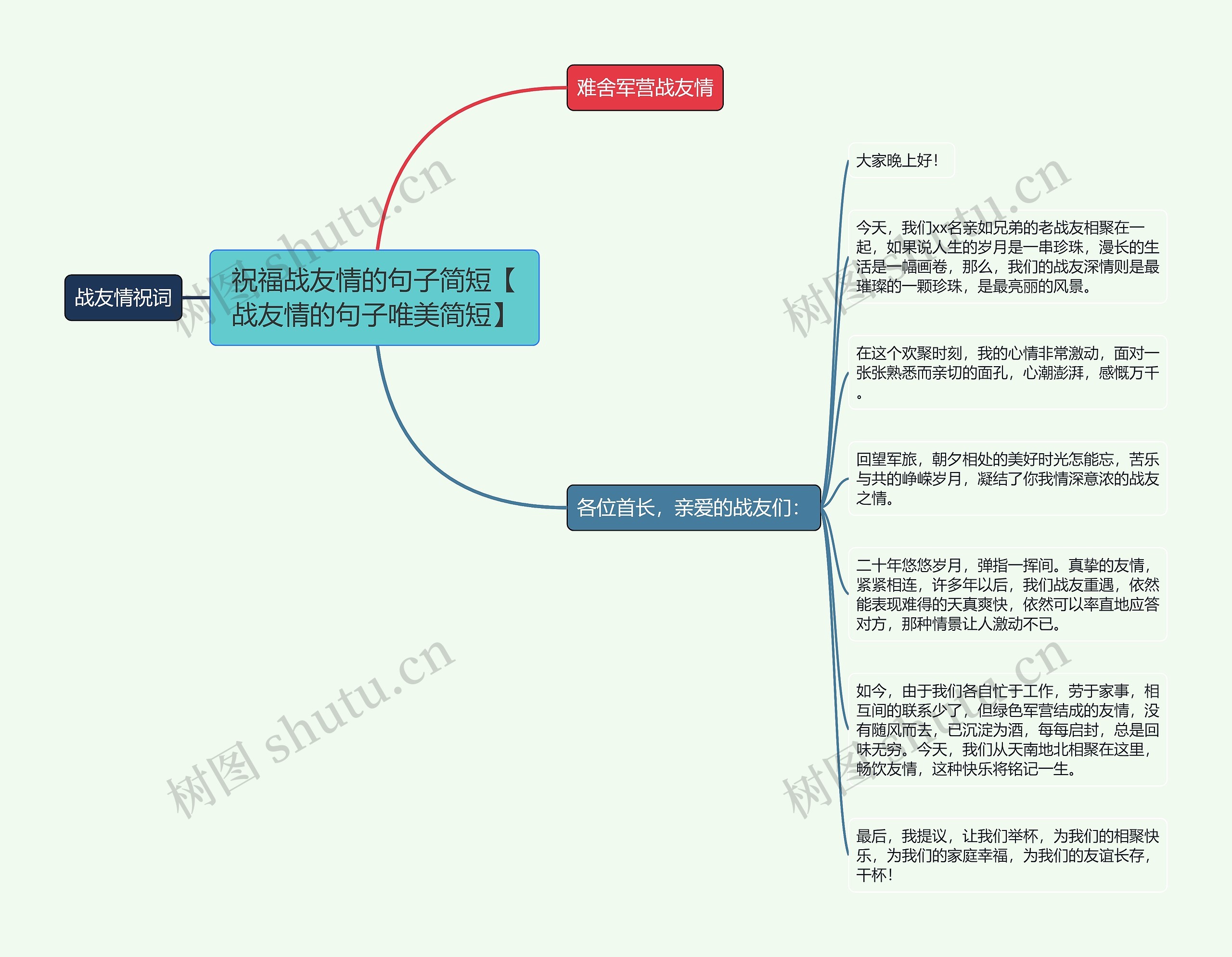 树图思维导图提供《祝福战友情的句子简短【战友情的句子唯美简短】》在线思维导图免费制作,点击“编辑”按钮,可对《祝福战友情的句子简短【战友情的句子唯美简短】》进行在线思维导图编辑,本思维导图属于思维导图模板主题,文件编号是:ff2e662ec504fc883722121ecd5c41c6
