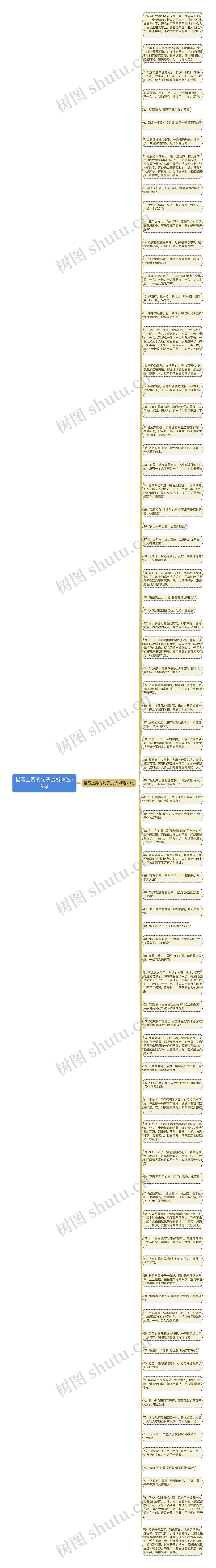 54. 那些笼罩在山头的云雾,就像是戴在山顶上的白色绒帽;那些缠绕在半山的云雾,又像是系在山腰间的一条条玉带。云雾弥漫山谷,它是茫茫的大海;云雾遮挡山峰,它又是巨大的天幕。