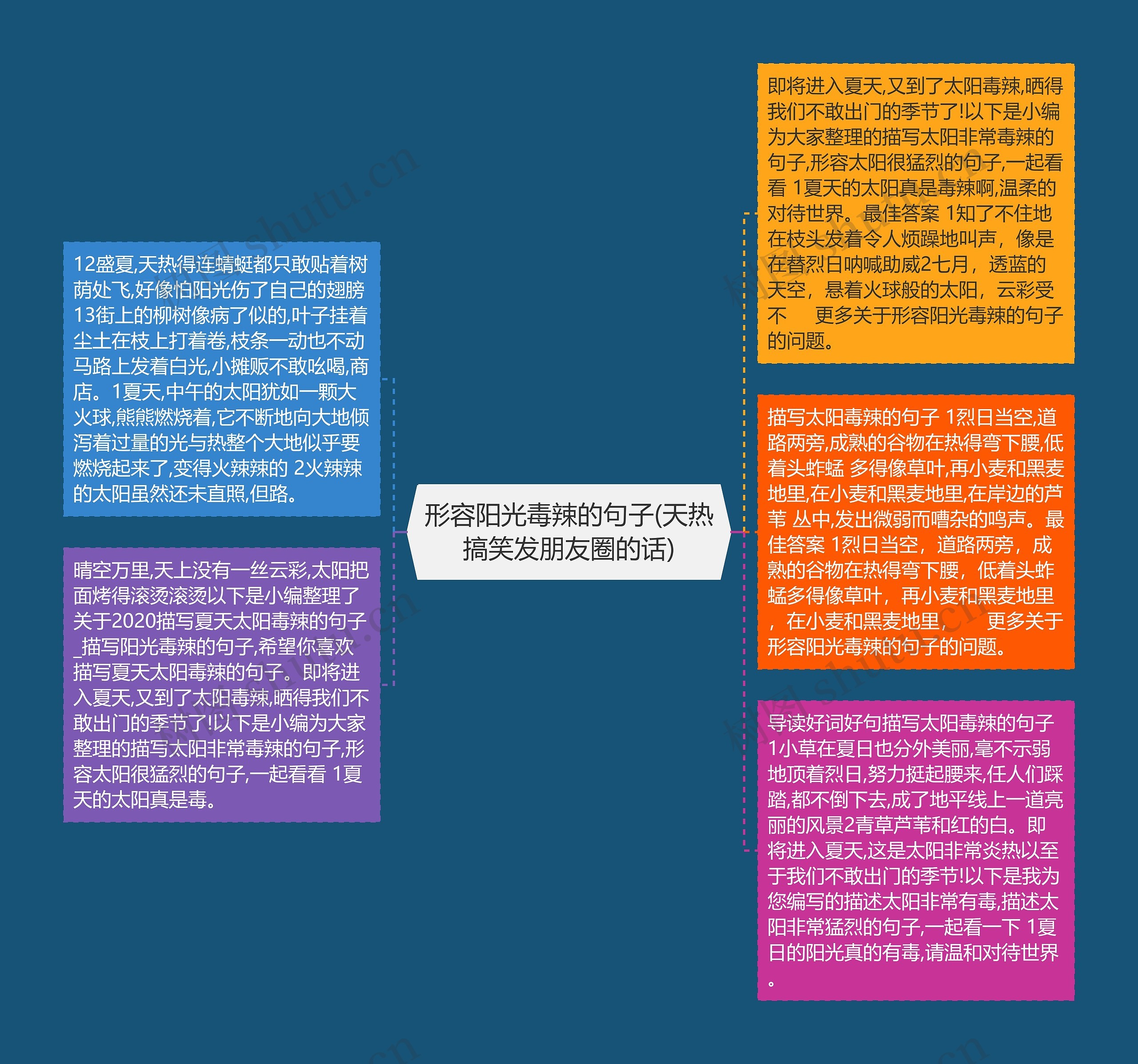 即将进入夏天,又到了太阳毒辣,晒得我们不敢出门的季节了!以下是小编为大家整理的描写太阳非常毒辣的句子,形容太阳很猛烈的句子,一起看看 1夏天的太阳真是毒辣啊,温柔的对待世界。最佳答案 1知了不住地在枝头发着令人烦躁地叫声,像是在替烈日呐喊助威2七月,透蓝的天空,悬着火球般的太阳,云彩受不 更多关于形容阳光毒辣的句子的问题。