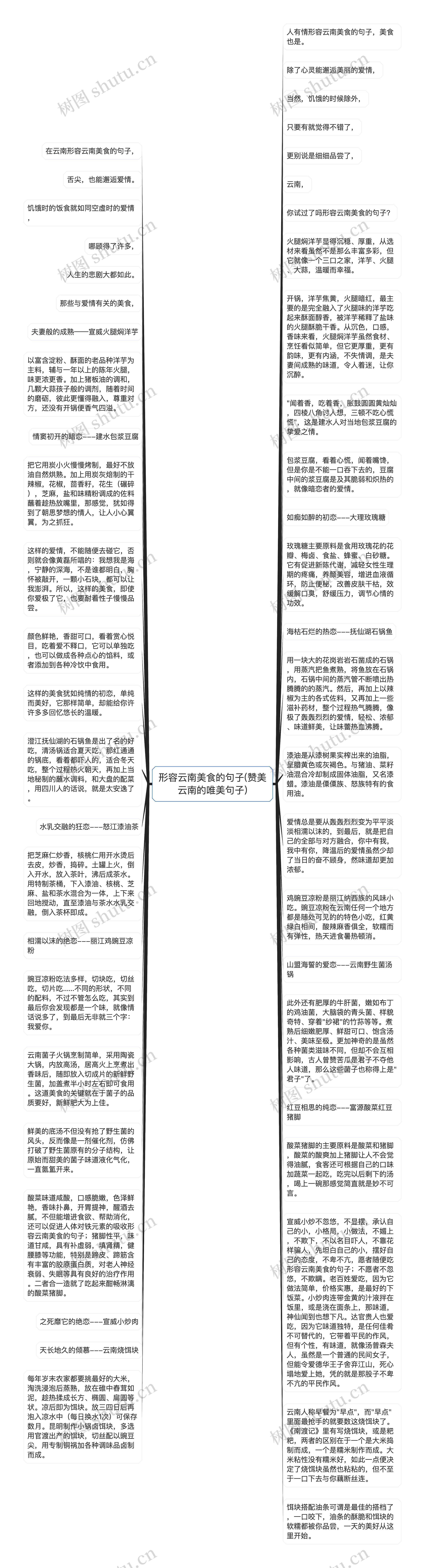 宣威小炒不忽悠,不显摆,承认自己的小,小格局,小做法,不媚上,不欺下,不以名目吓人,不靠花样骗人,先坦白自己的小,摆好自己的态度,不卑不亢,愿者随便吃形容云南美食的句子;不愿者不忽悠,不欺瞒。老百姓爱吃,因为它做法简单,价格实惠,是最好的下饭菜。小炒肉连带金黄的汁液拌在饭里,或是浇在面条上,那味道,神仙闻到也想下凡。达官贵人也爱吃,因为它味道独特,是任何佳肴不可替代的,它带着平民的作风,但有个性,有味道,就像汤普森夫人,虽然是一个普通的民间女子,但能令爱德华王子舍弃江山,死心塌地爱上她,凭的就是那股子不卑不亢的平民作风。