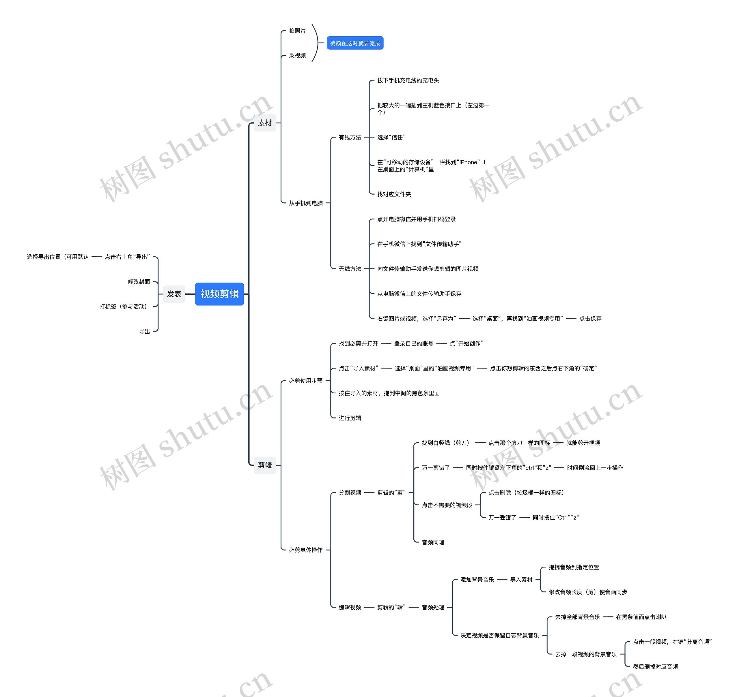 树图思维导图提供《视频剪辑》在线思维导图免费制作,点击“编辑”按钮,可对《视频剪辑》进行在线思维导图编辑,本思维导图属于思维导图模板主题,文件编号是:5873168414c9591bae56d6047273843e