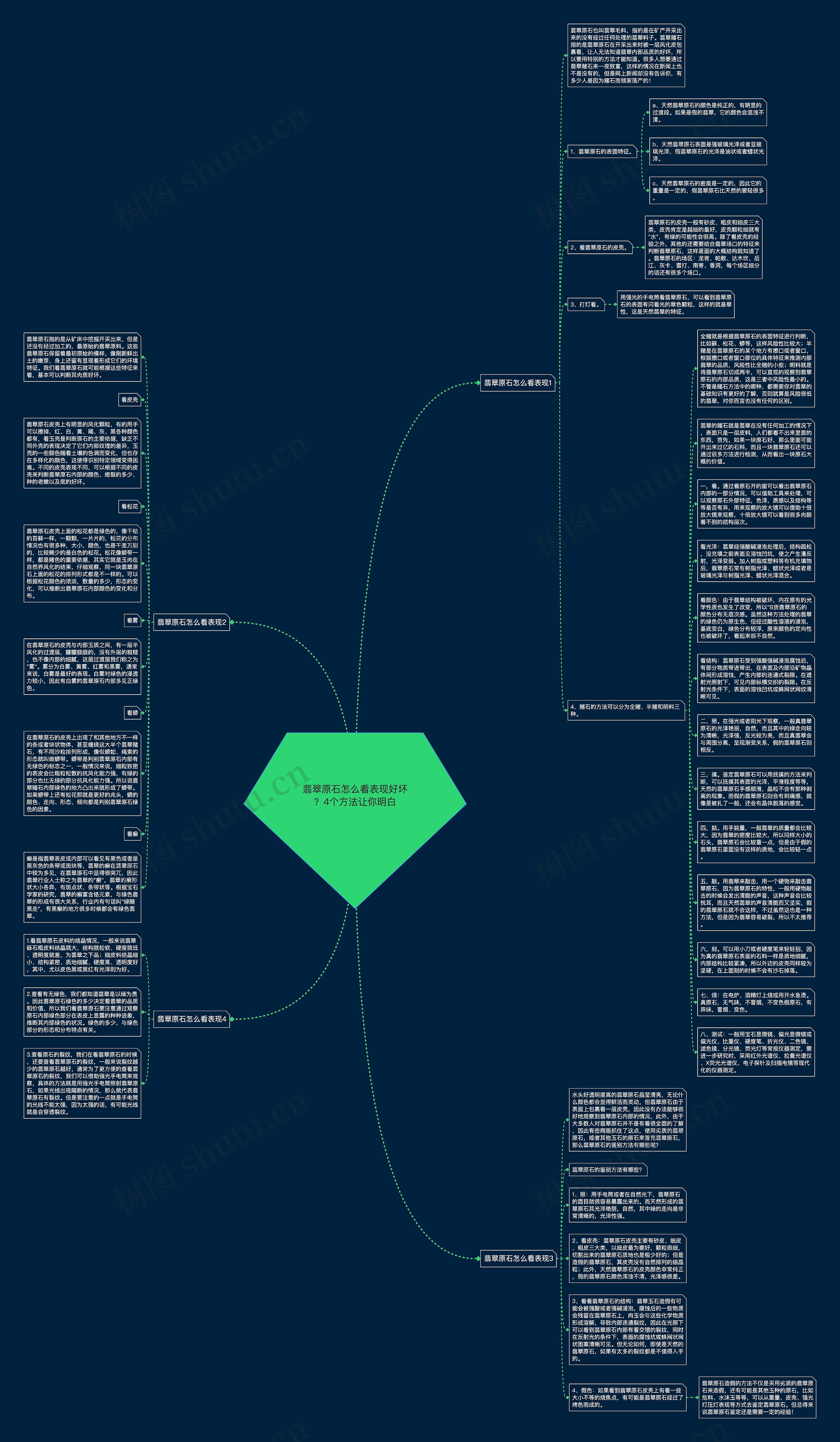 看颜色:由于翡翠结构被破坏,内在原有的光学性质也发生了改变,所以"B货翡翠原石的颜色分布无层次感。虽然这种方法处理的翡翠的绿色仍为原生色,但经过酸性溶液的浸泡,基底变白,绿色分布较浮,原来颜色的定向性也被破坏了,看起来很不自然。