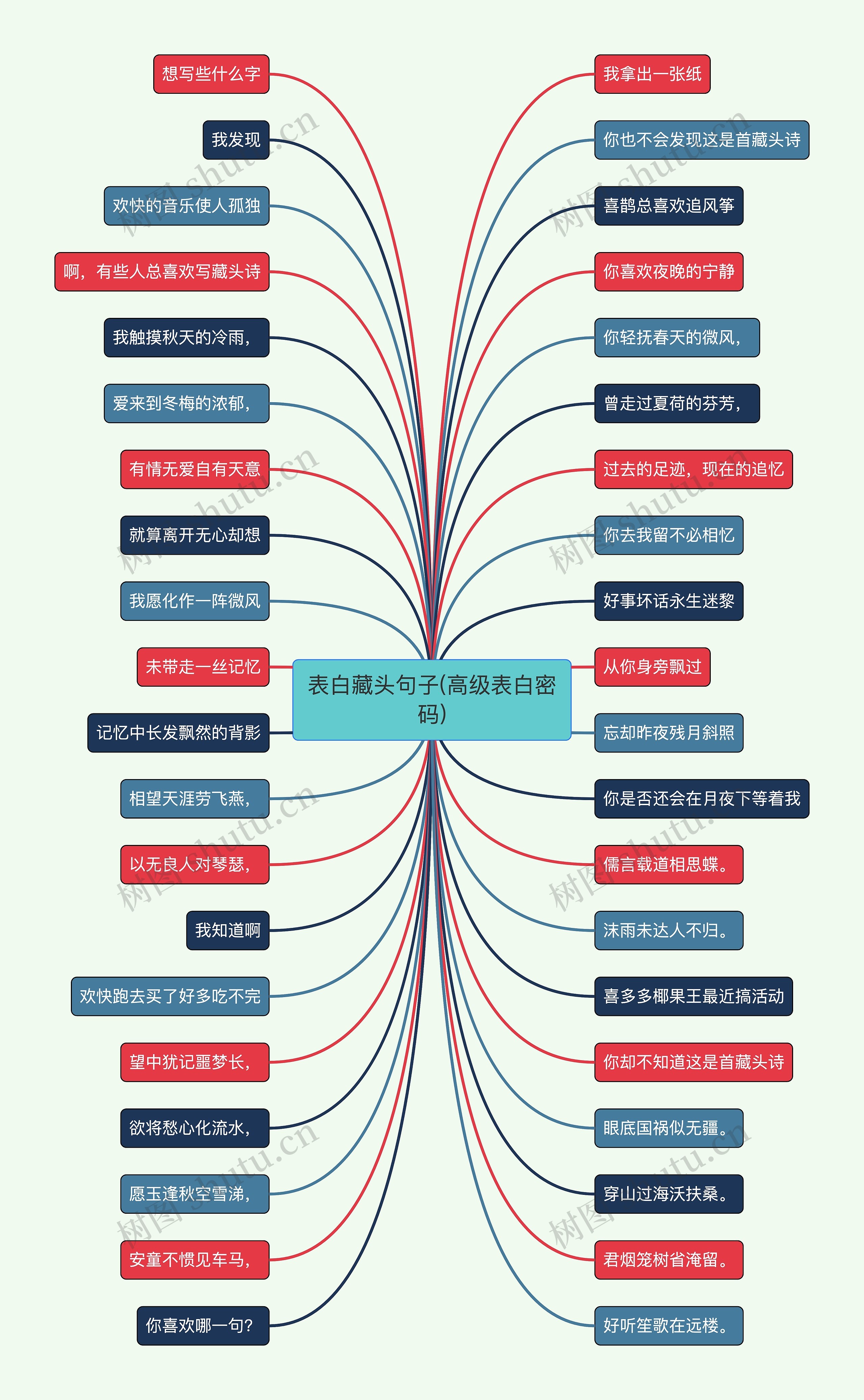 树图思维导图提供《表白藏头句子(高级表白密码)》在线思维导图免费制作,点击“编辑”按钮,可对《表白藏头句子(高级表白密码)》进行在线思维导图编辑,本思维导图属于思维导图模板主题,文件编号是:fc2e6057ee3c75437f06b689556ca133