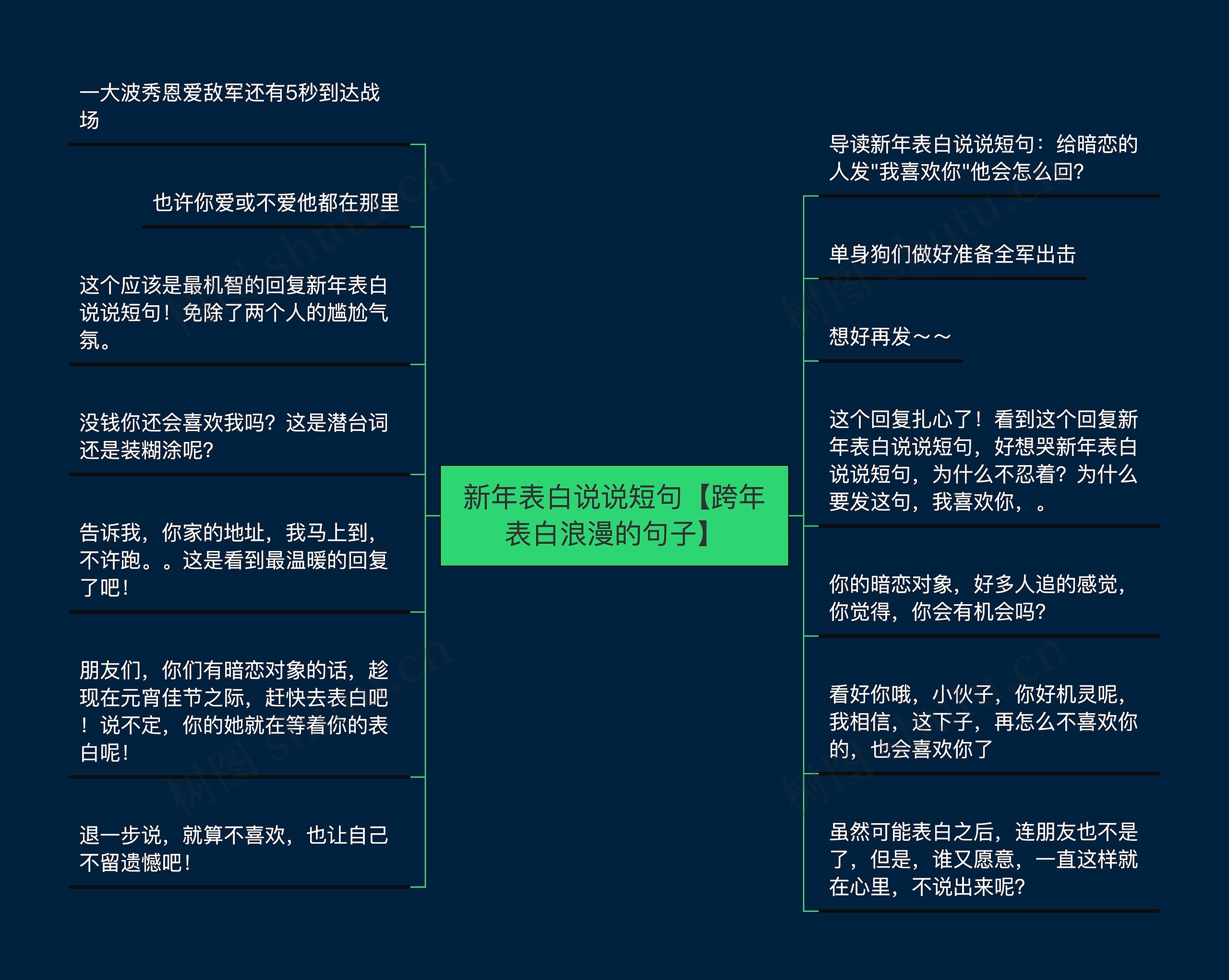 树图思维导图提供《新年表白说说短句【跨年表白浪漫的句子】》在线思维导图免费制作,点击“编辑”按钮,可对《新年表白说说短句【跨年表白浪漫的句子】》进行在线思维导图编辑,本思维导图属于思维导图模板主题,文件编号是:952f7eaad3cb3724240f69ad3078149a