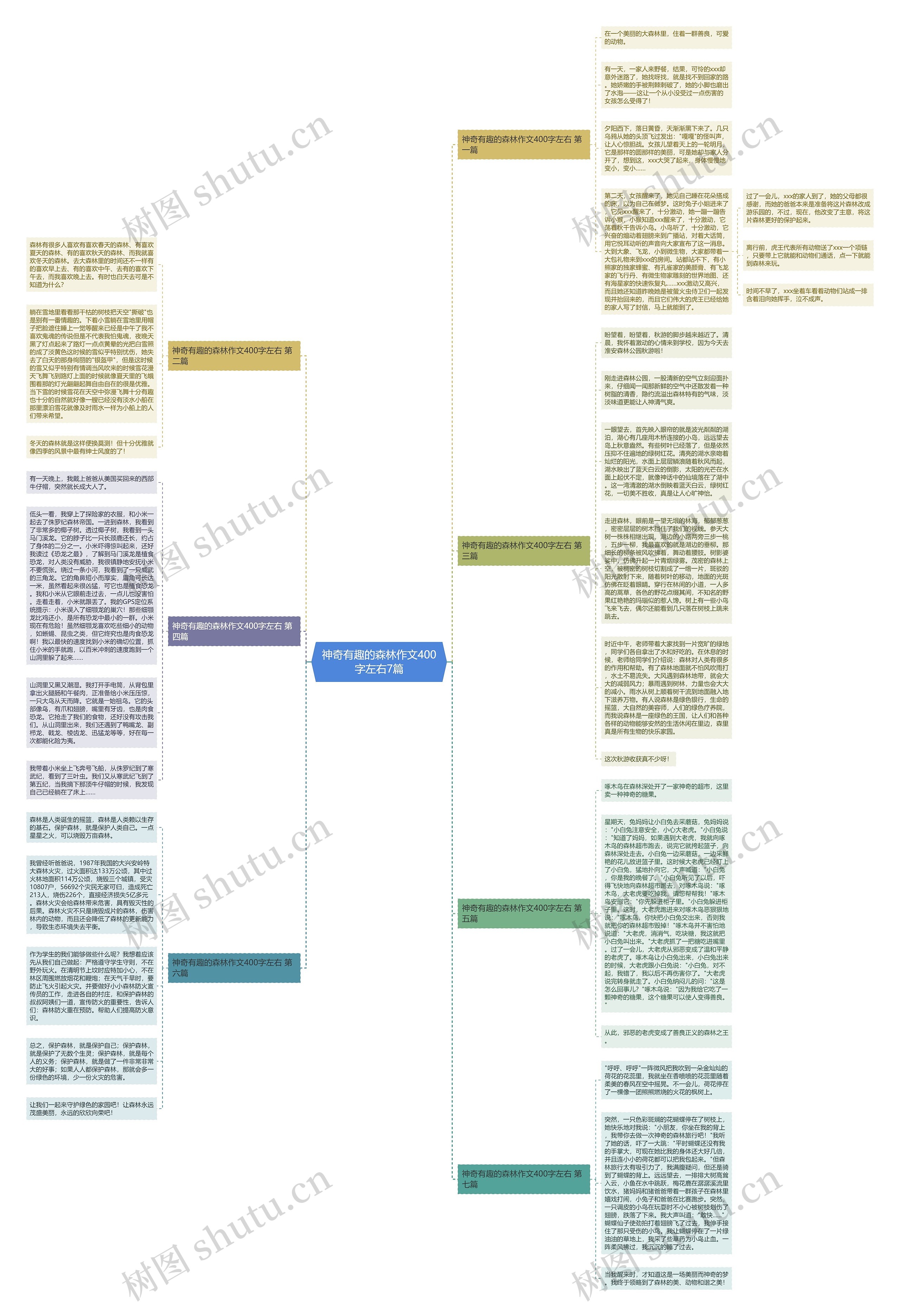 时近中午,老师带着大家找到一片宽旷的绿地,同学们各自拿出了水和好吃的。在休息的时候,老师给同学们介绍说:森林对人类有很多的作用和帮助。有了森林地面就不怕风吹雨打,水土不易流失。大风遇到森林地带,就会大大的减弱风力;暴雨遇到树林,力量也会大大的减小。雨水从树上顺着树干流到地面融入地下滋养万物。有人说森林是绿色银行,生命的摇篮,大自然的美容师,人们的绿色疗养院,而我说森林是一座绿色的王国,让人们和各种各样的动物能够安然的生活休闲在里边,森里真是所有生物的快乐家园。