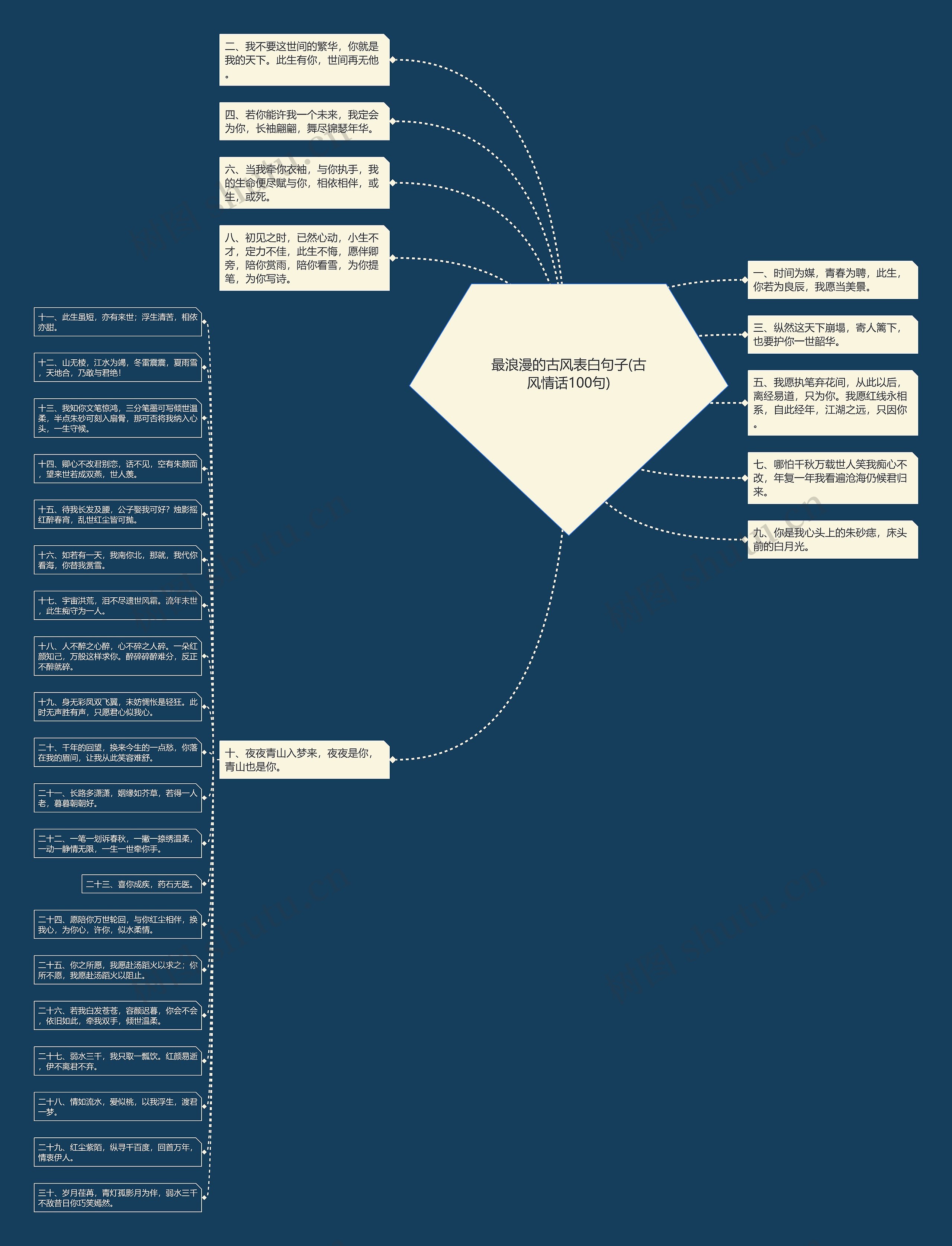 树图思维导图提供《最浪漫的古风表白句子(古风情话100句)》在线思维导图免费制作,点击“编辑”按钮,可对《最浪漫的古风表白句子(古风情话100句)》进行在线思维导图编辑,本思维导图属于思维导图模板主题,文件编号是:eeaa3ead755870d1f6fc975e0be7907f