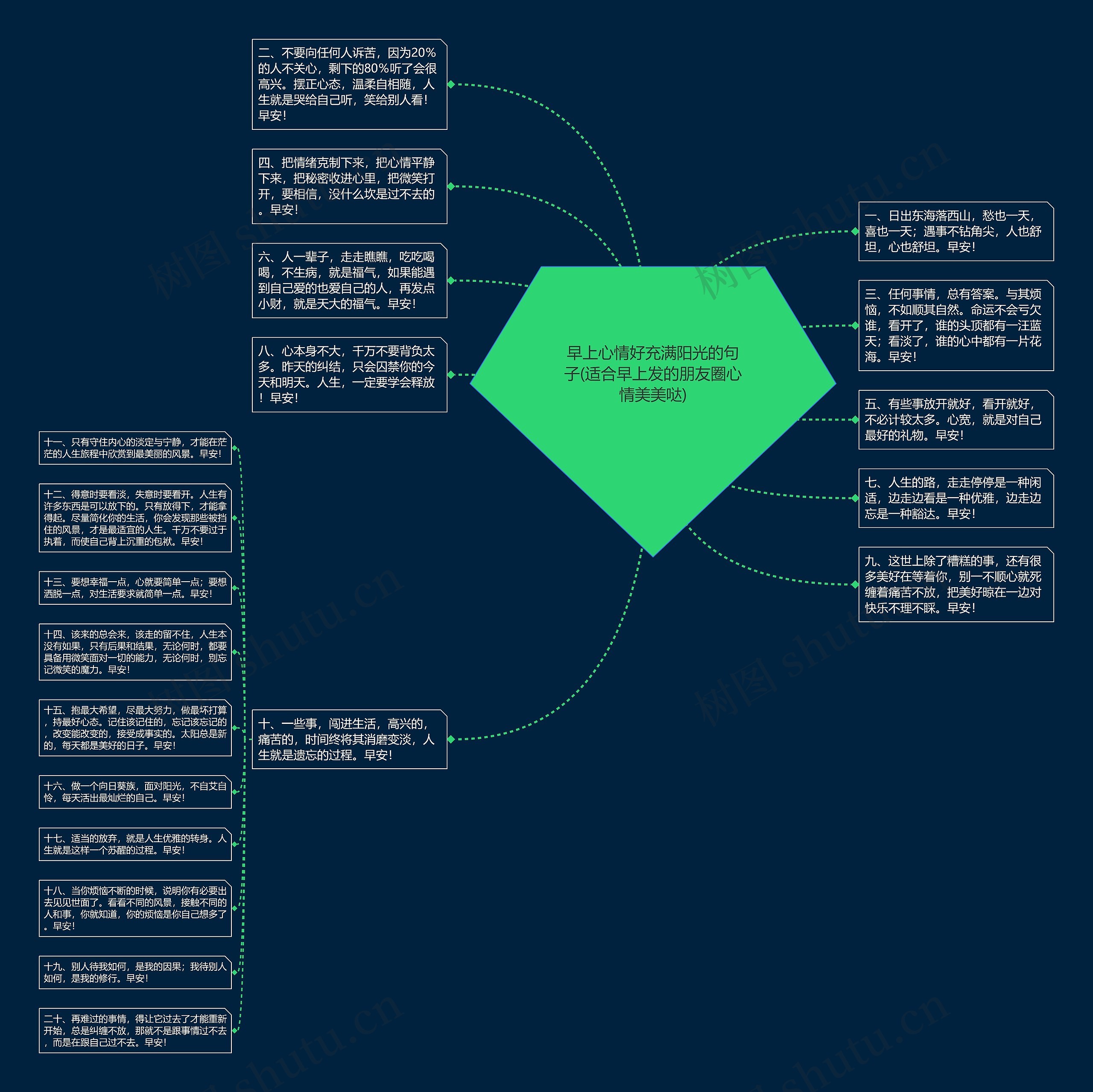 树图思维导图提供《早上心情好充满阳光的句子(适合早上发的朋友圈心情美美哒)》在线思维导图免费制作,点击“编辑”按钮,可对《早上心情好充满阳光的句子(适合早上发的朋友圈心情美美哒)》进行在线思维导图编辑,本思维导图属于思维导图模板主题,文件编号是:62c2cbd7d502a64423ac9aa782f20f64