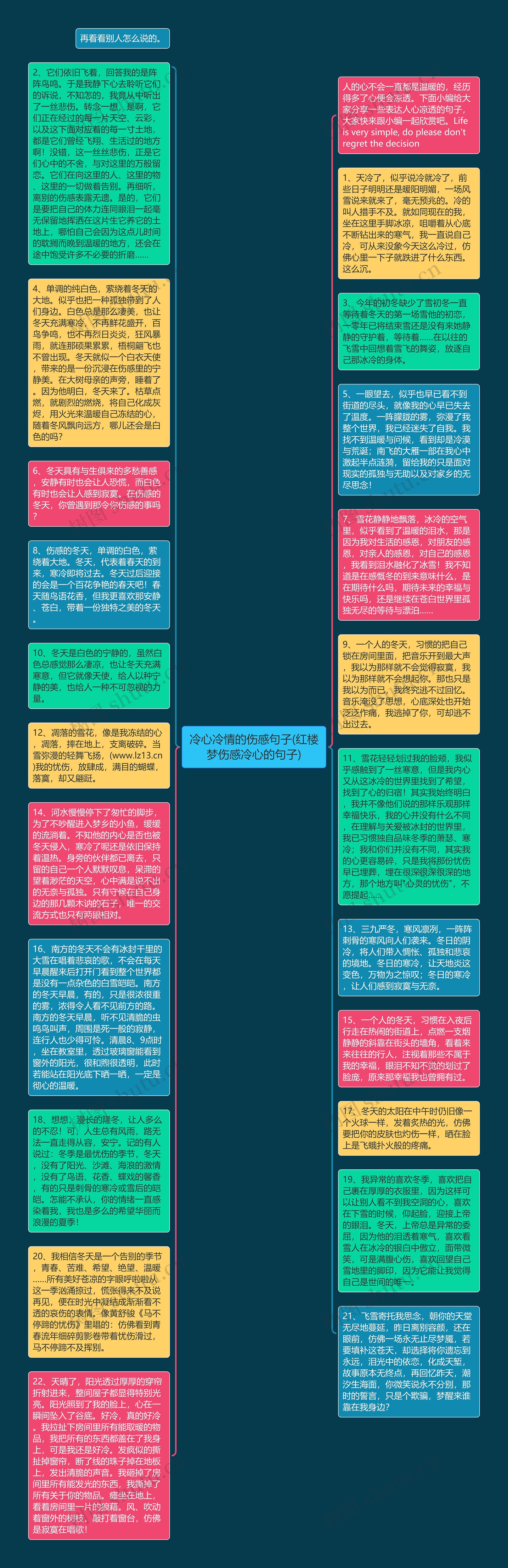 18、想想,漫长的隆冬,让人多么的不忍!可,人生总有风雨,路无法一直走得从容,安宁。记的有人说过:冬季是最忧伤的季节,冬天,没有了阳光、沙滩、海浪的激情,没有了鸟语、花香、蝶戏的馨香,有的只是刺骨的寒冷或雪后的皑皑。怎能不承认,你的情绪一直感染着我,我也是多么的希望华丽而浪漫的夏季!