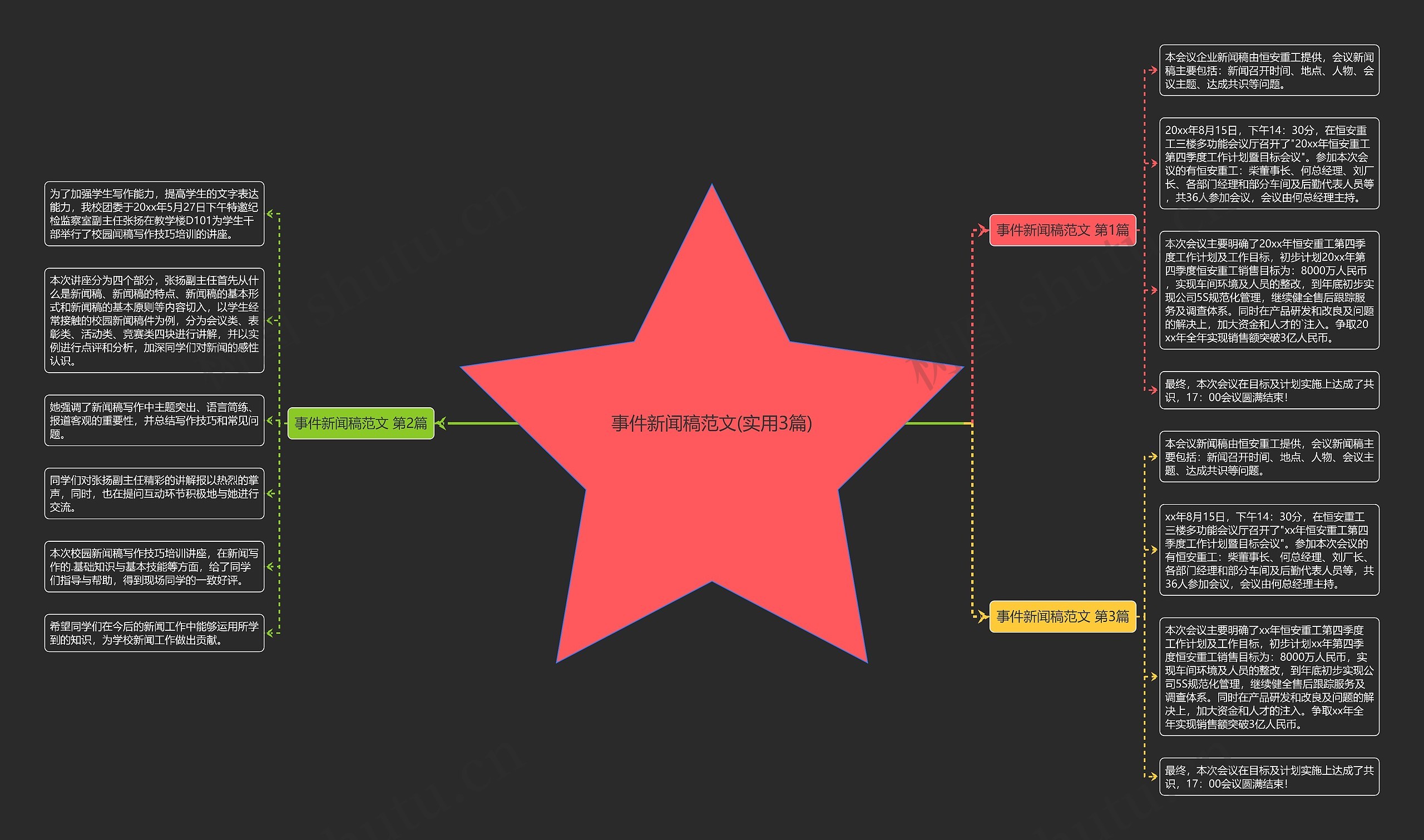 树图思维导图提供《事件新闻稿范文(实用3篇)》在线思维导图免费制作,点击“编辑”按钮,可对《事件新闻稿范文(实用3篇)》进行在线思维导图编辑,本思维导图属于思维导图模板主题,文件编号是:39703293ff8e9e742936e8117f990324