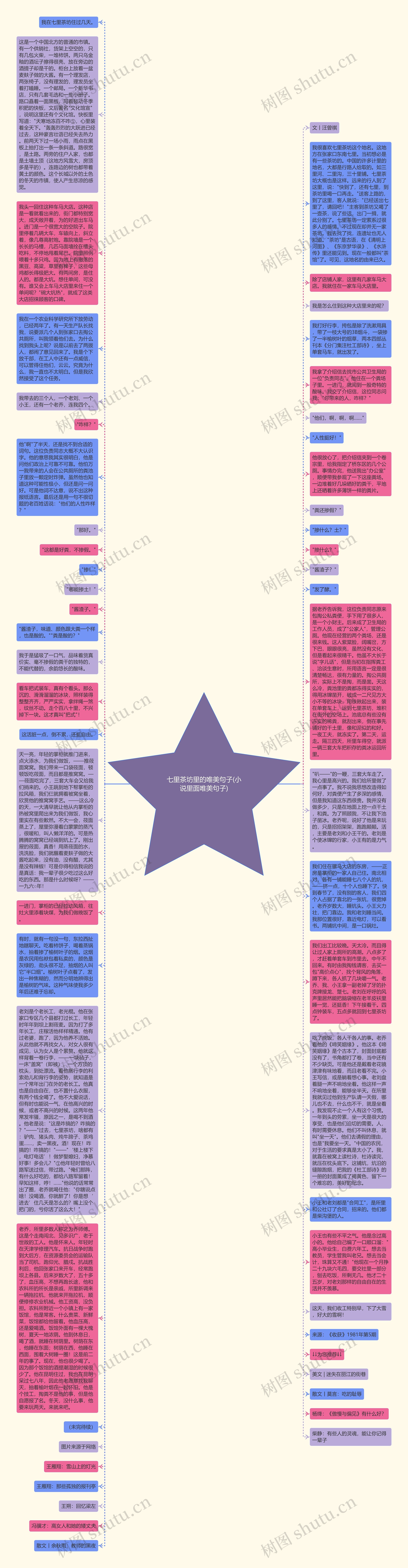 这是一个中国北方的普通的市镇。有一个供销社,货架上空空的,只有几包火柴,一堆柿饼。两只乌金釉的酒坛子擦得很亮,放在旁边的酒提子却是干的。柜台上放着一盆麦麸子做的大酱。有一个理发店,两张椅子,没有理发的,理发员坐着打瞌睡。一个邮局。一个新华书店,只有几套毛选和一些小册子。路口矗着一面黑板,写着鼓动冬季积肥的快板,文后署名"文化馆宣",说明这里还有个文化馆。快板里写道:"天寒地冻百不咋①,心里装着全天下。"轰轰烈烈的大跃进已经过去,这种豪言壮语已经失去热力。前两天下过一场小雨,雨点在黑板上抽打出一条一条斜道。路很宽,是土路。两旁的住户人家,也都是土墙土顶(这地方风雪大,房顶多是平的)。连路边的树也都带着黄土的颜色。这个长城以外的土色的冬天的市镇,使人产生悲凉的感觉。