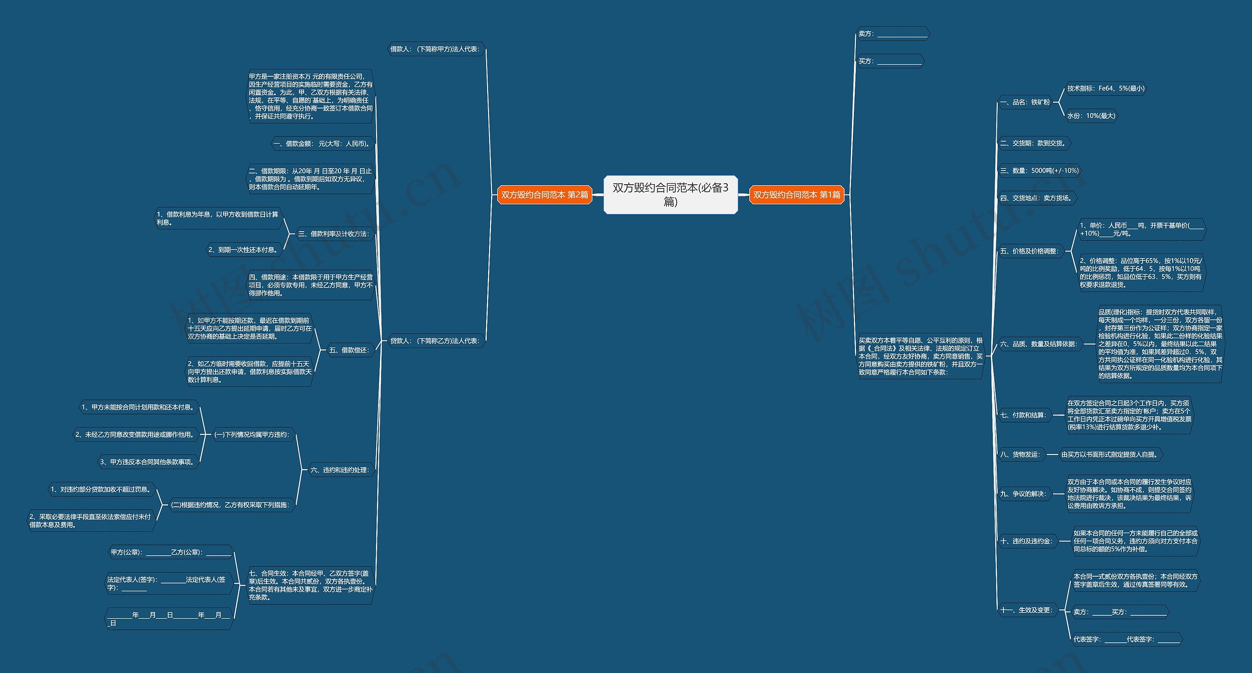 树图思维导图提供《双方毁约合同范本(必备3篇)》在线思维导图免费制作,点击“编辑”按钮,可对《双方毁约合同范本(必备3篇)》进行在线思维导图编辑,本思维导图属于思维导图模板主题,文件编号是:6897fbccb8b51eec011b1db5ce190e1f