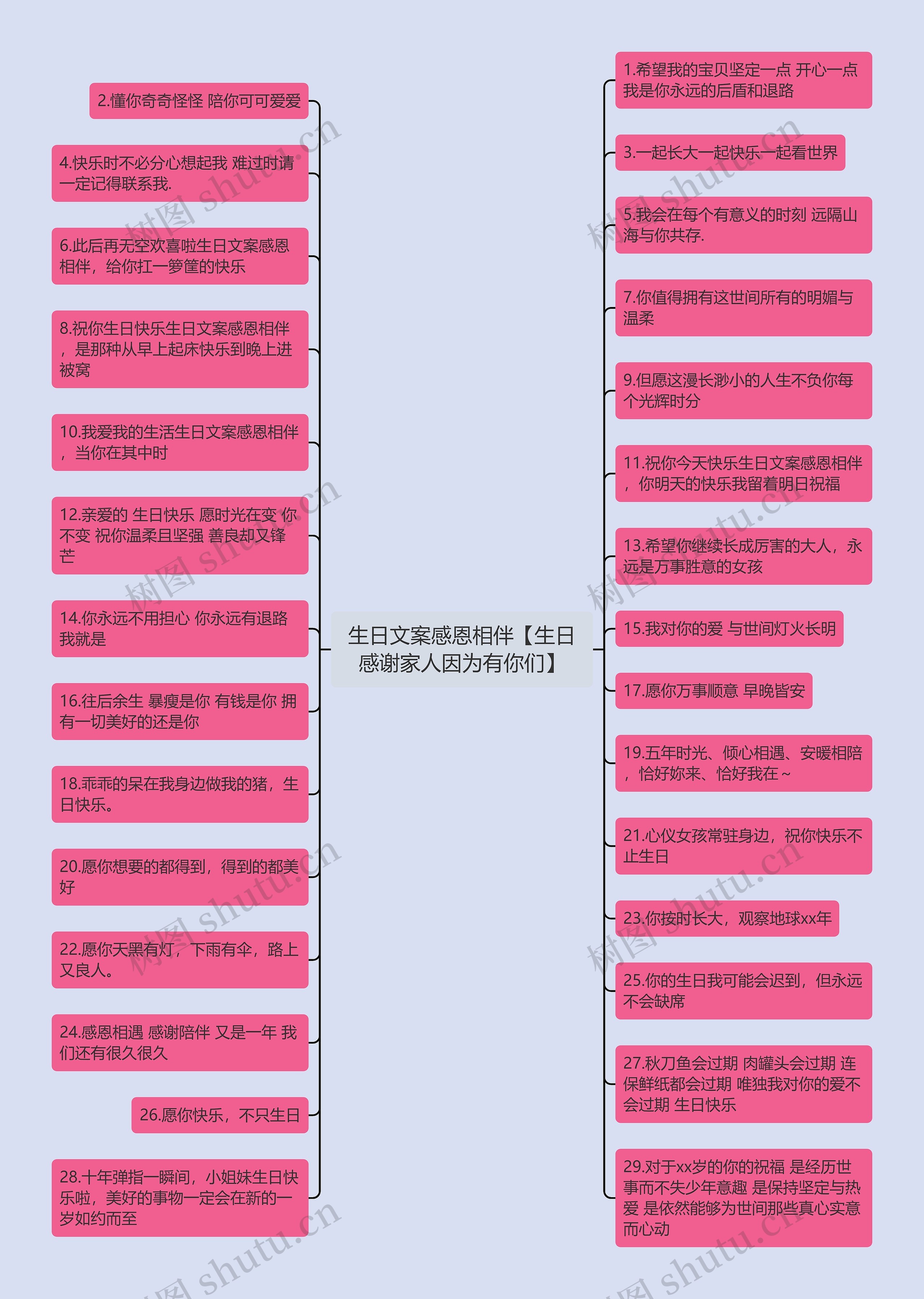 树图思维导图提供《生日文案感恩相伴【生日感谢家人因为有你们】》在线思维导图免费制作,点击“编辑”按钮,可对《生日文案感恩相伴【生日感谢家人因为有你们】》进行在线思维导图编辑,本思维导图属于思维导图模板主题,文件编号是:2f1d8202b941cc4fda626fecea4cf8f6